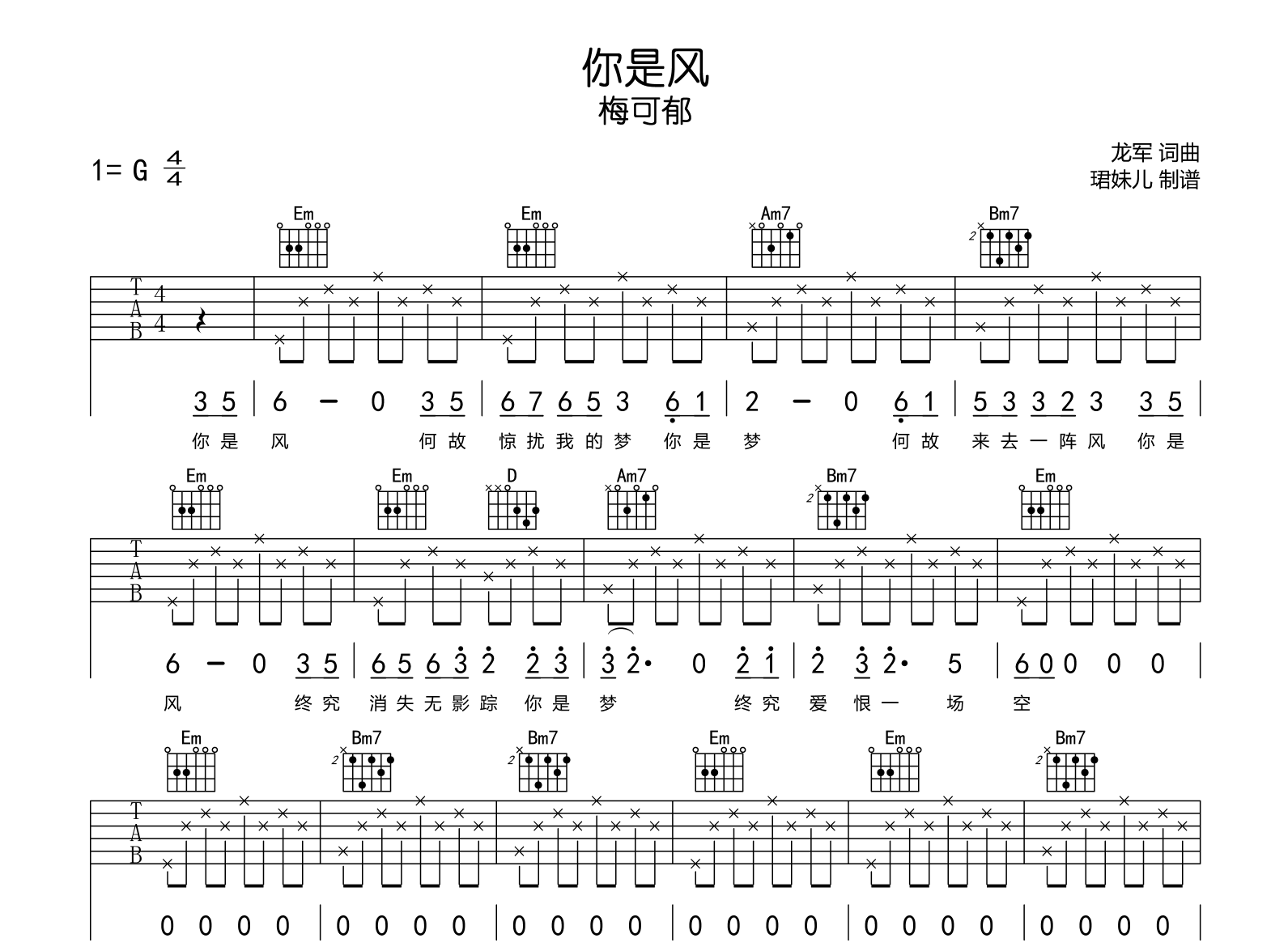 曲谱介绍: 你是风吉他谱,梅可郁演唱,《你是风》吉他弹唱谱,采用G调指法编配,速度100BPM,难度较简单,演奏易上手。完整版共三张高清图片谱。