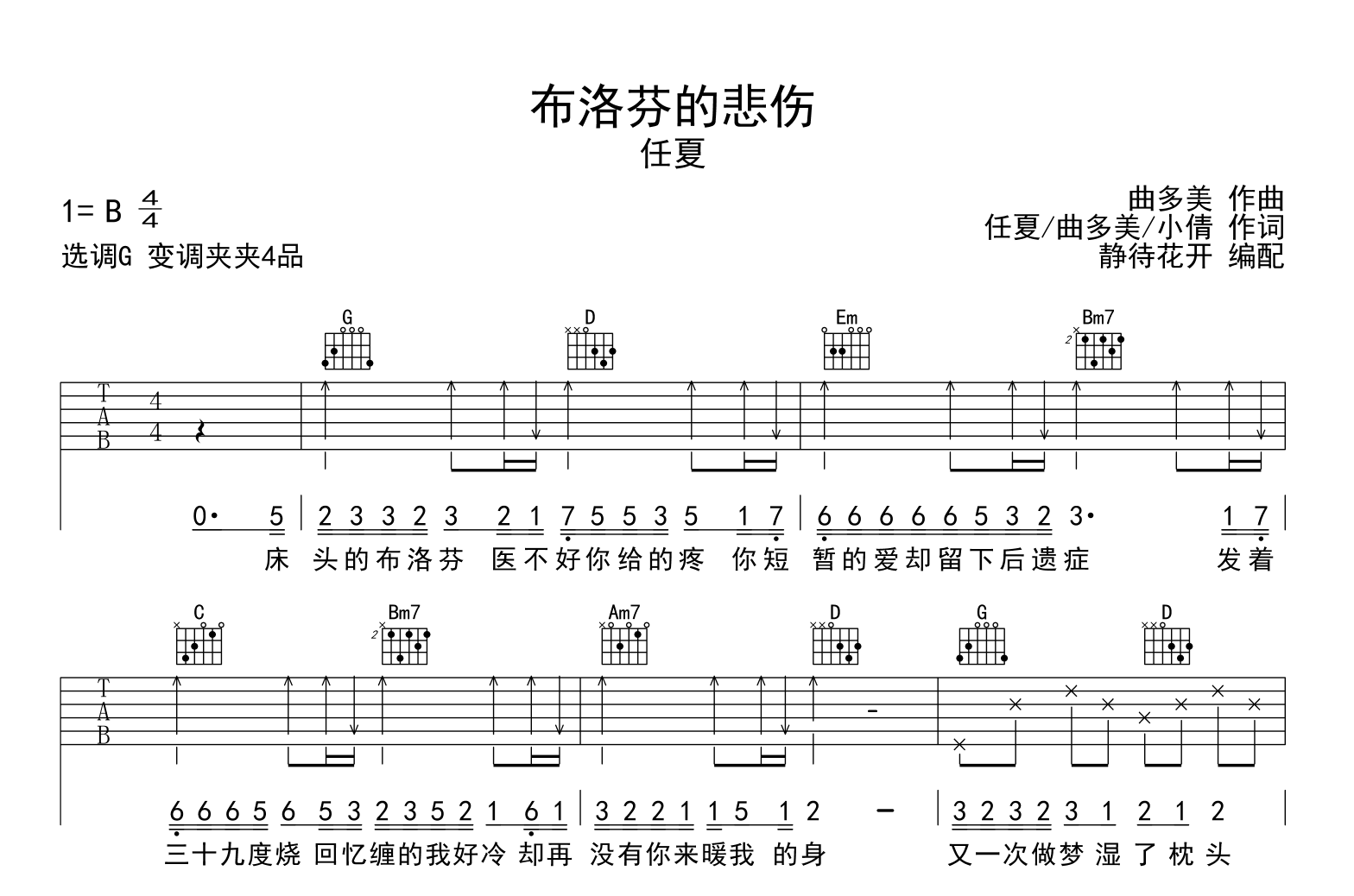 曲谱介绍: 布洛芬的悲伤吉他谱,任夏演唱的一首网络热门伤感情歌。《布洛芬的悲伤》吉他弹唱谱,编配制谱采用G调和弦编配,演奏建议变调夹夹第4品,原调B调,琴友们也可以根据自己嗓音条件选择变调夹,演奏速度大概80拍每分钟,难度简单。