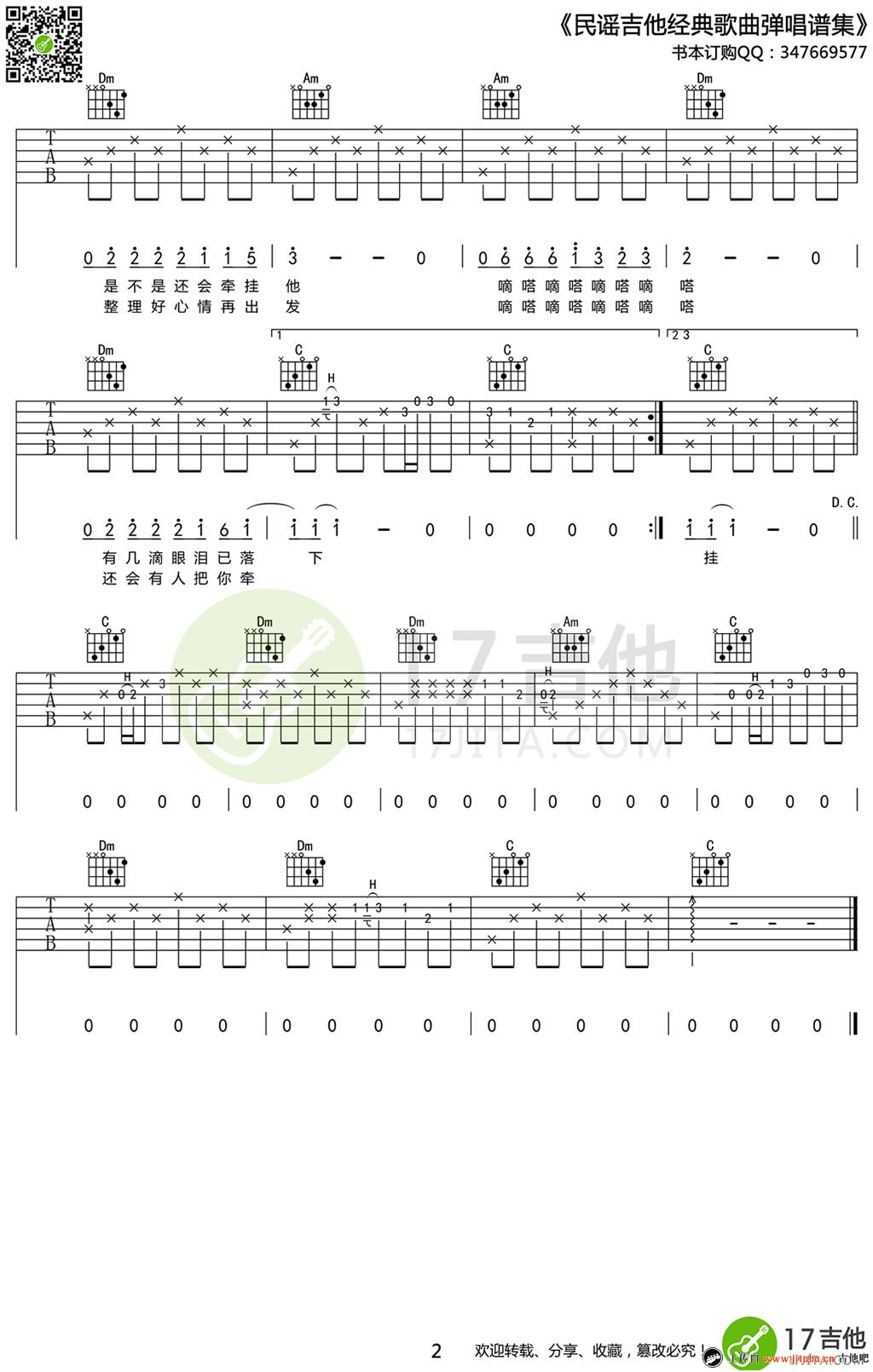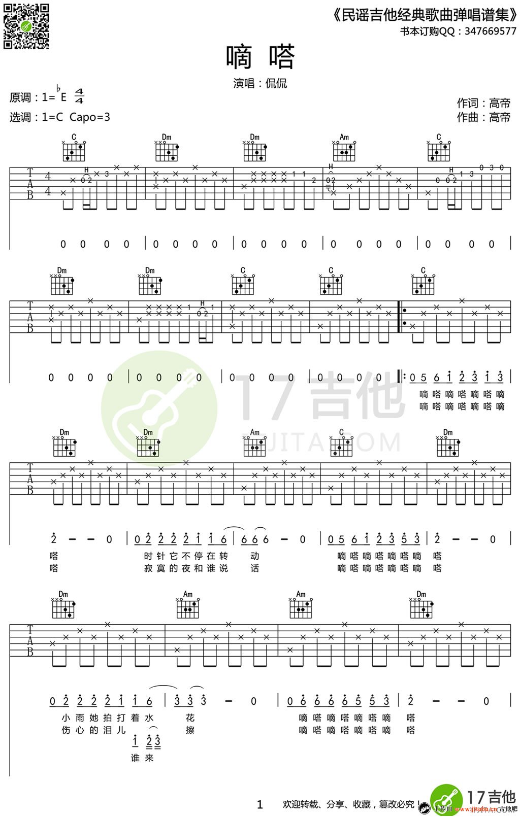 曲谱介绍: www.jitaba.cn 91吉他谱 推荐其他编配版本 嘀嗒吉他谱_C调带前奏间奏 滴答吉他谱男生版_G调弹唱谱