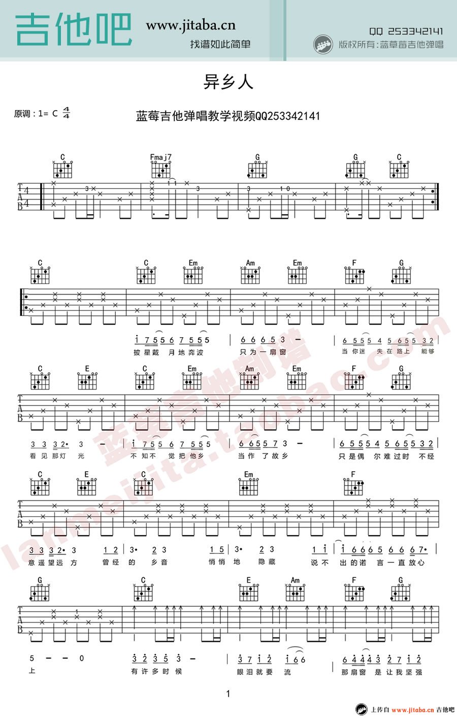 曲谱介绍: www.jitaba.cn 吉他谱网站不同编配版本 李健《异乡人》吉他谱原版 异乡人吉他谱_中国好声音张磊版本