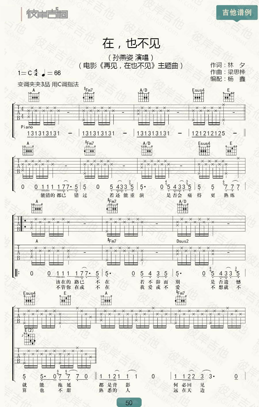 曲谱介绍: 孙燕姿演唱的《在,也不见》吉他谱,变调夹夹三品,用C调指法。在也不见吉他谱,孙燕姿为电影《再见,在也不见》主题曲献声。感谢杨鑫老师编配曲谱,并为琴友们带来这首歌曲的弹唱教学视频。