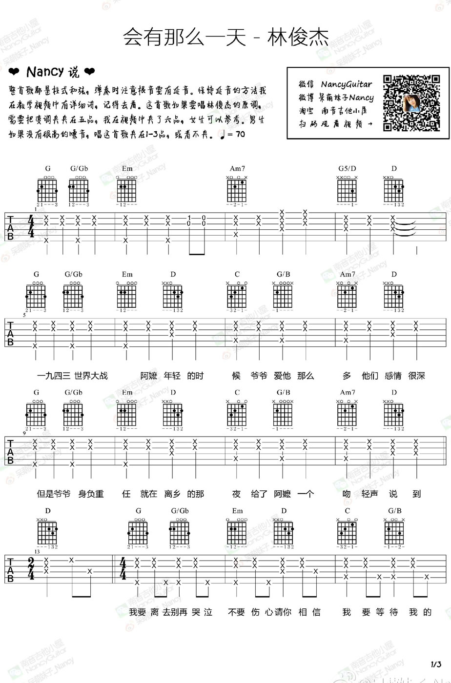 曲谱介绍: 会有那么一天吉他谱,林俊杰演唱,会有那么一天,吉他弹唱六线谱编配,NANCY老师说,整首歌都是柱式和弦,弹奏时注意根音要有延音。如果要唱林俊杰的原调,需要把变调夹夹在第五品。视频教学演示中夹了六品,女生可以参考。男生如果没有很高的嗓音,唱这首歌夹1-3品,或者不夹。