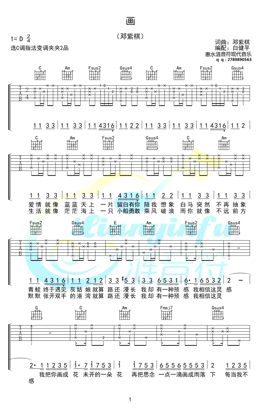 曲谱介绍: 邓紫棋画吉他谱,原调D,选用C调指法变调夹夹第二品。邓紫棋词曲创作的歌曲《画》,轻快的旋律,温柔的唱腔,宛转悠扬,如梦中的灰姑娘。简单的情歌吉他弹唱,倾诉一份眷恋和思念。六线谱编配,图片谱高清版。