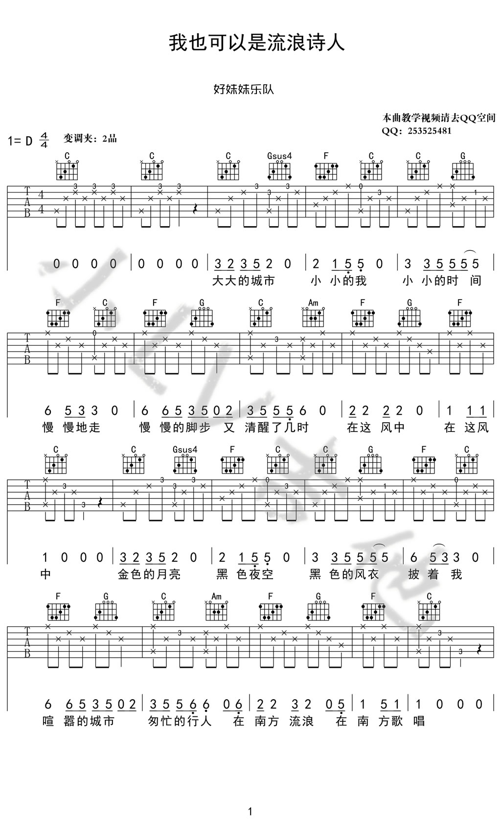 曲谱介绍: 好妹妹乐队我也可以是流浪诗人吉他谱,六线谱编配,变调夹夹2品。我也可以是流浪诗人吉他谱,弹唱谱高清图片格式。夜色渐深,静静聆听,流浪的诗人,拿着吉他,喧嚣的城市,匆忙的行人,在南方流浪,在南方歌唱,那就走吧。牵动内心的歌词,脑海里似乎勾画了一个景象。虽说不是每个人能成为诗人,但每个人可以流浪!但这“流浪”不是虚无缥缈的流浪,每一次“流浪”只为下一步走的更稳健!