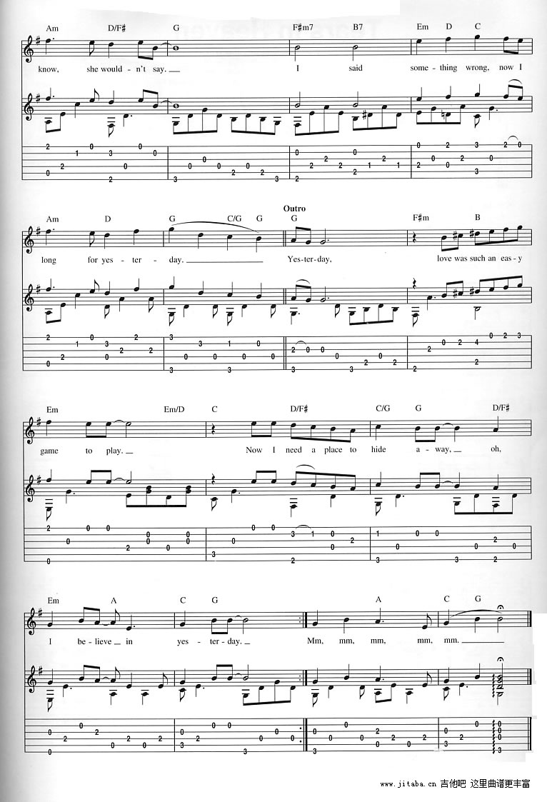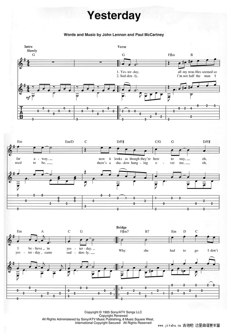 曲谱介绍: yesterday吉他谱,初级指弹版,The Beatles甲壳虫乐队的代表歌曲,yesterday吉他独奏谱,图片谱格式,简单的谱子,致敬经典。世界最伟大的流行歌曲,披头士乐队的经典老歌“Yesterday”(昨日)被传唱近四十年,经久不衰。
