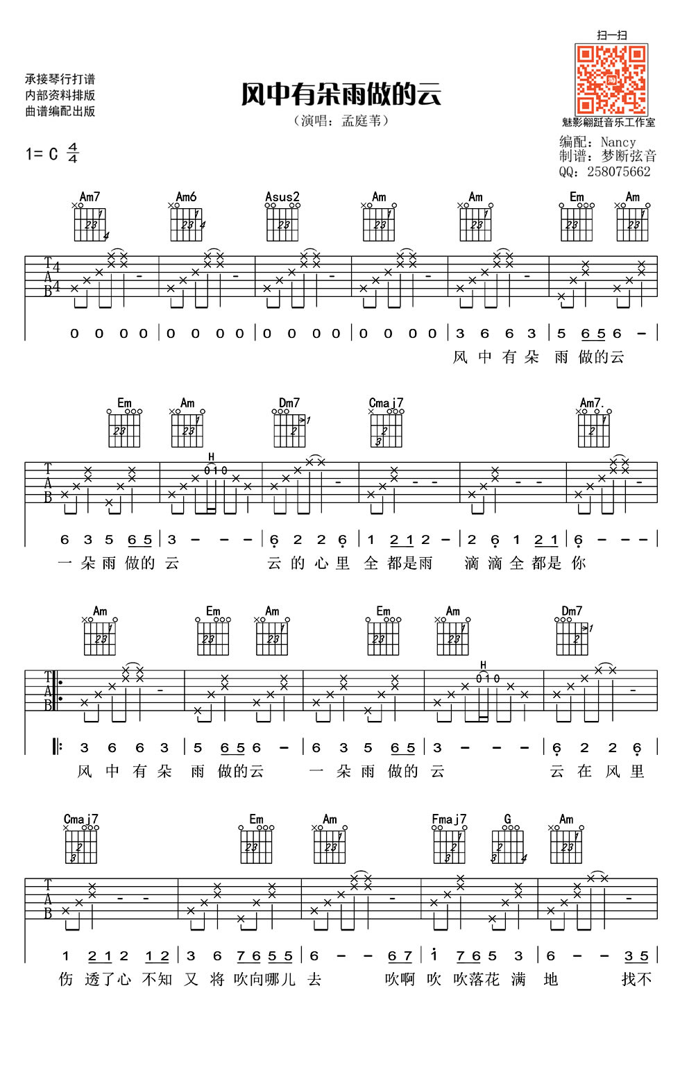 曲谱介绍: 孟庭苇 风中有朵雨做的云吉他谱,C调指法,六线谱高清图片,故乡Nancy编配。风中有朵雨做的云吉他弹唱谱,经典的旋律,空澈的歌声,不管历经多少年岁月的洗礼,永恒的旋律再次回响在耳边,依然是不变的感动。