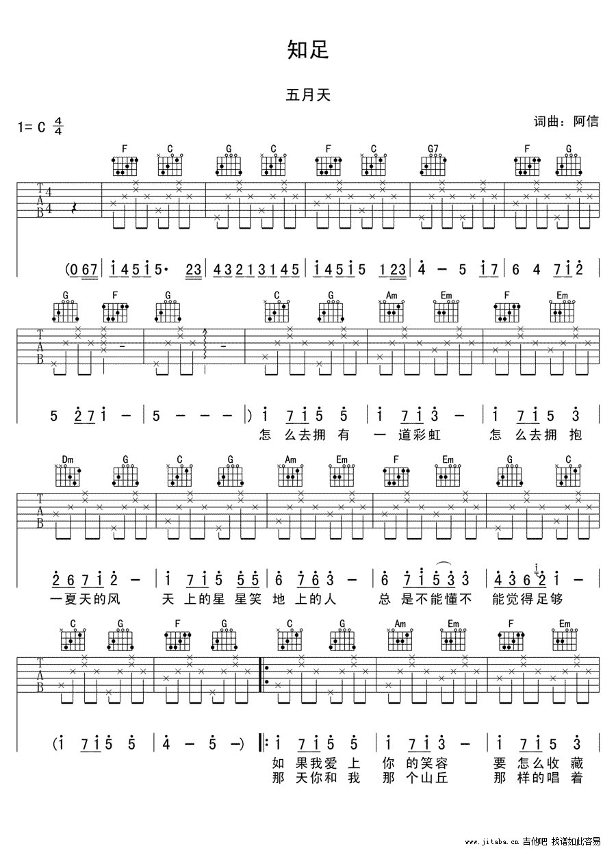 曲谱介绍: 五月天知足吉他谱,C调六线谱,知足吉他弹唱谱,五月天的歌曲总让人怀念旧时光,体会那歌词里散发的共鸣声。