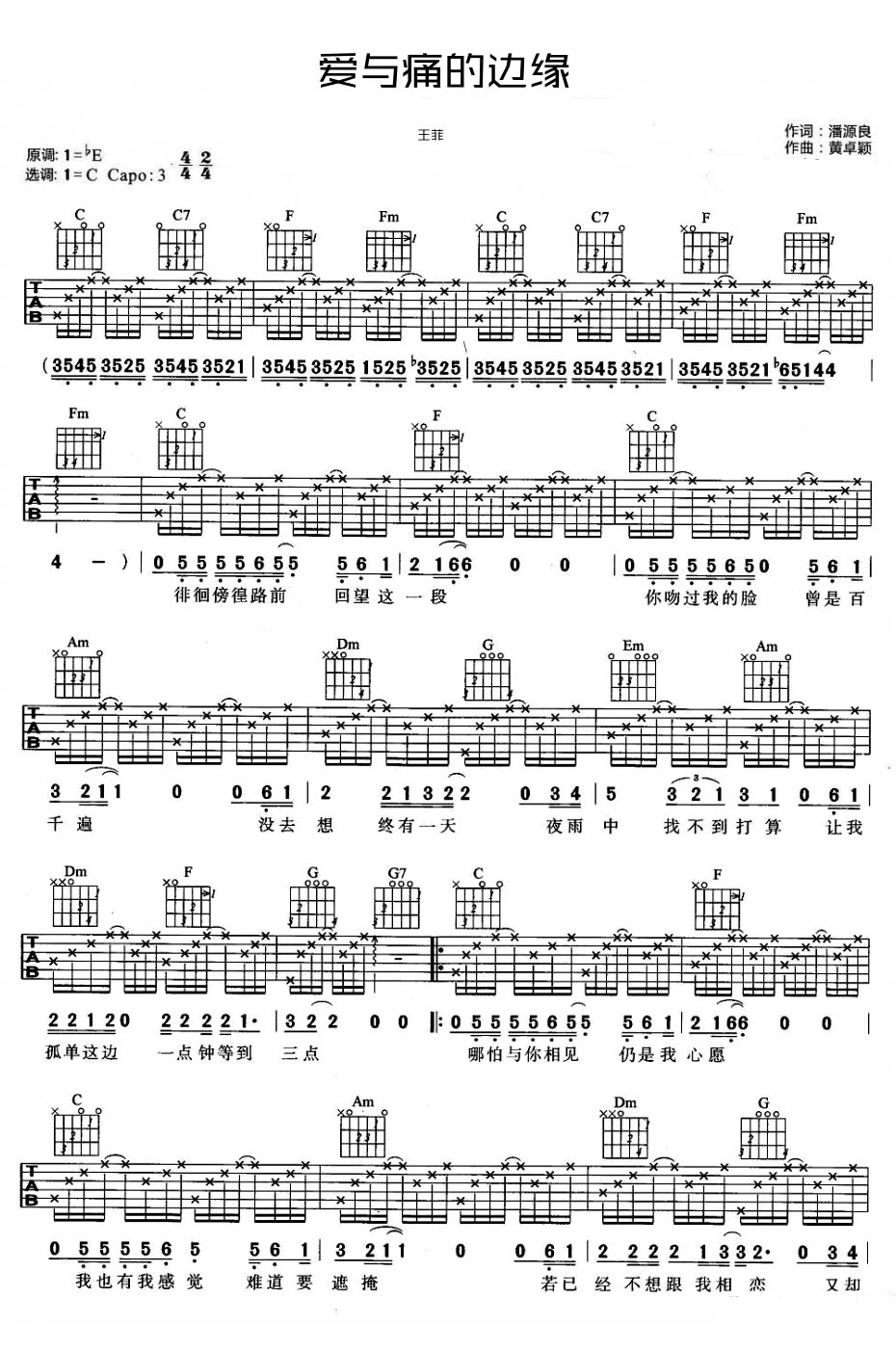 曲谱介绍: 王菲 爱与痛的边缘吉他谱,原调降E调,选调C调,变调夹夹三品。爱与痛的边缘六线谱,图片谱高清版编配,天后王菲演唱的怀旧金曲,一首痴缠婉转的粤语歌曲,国语版是迪克牛仔的《有多少爱可以重来》。