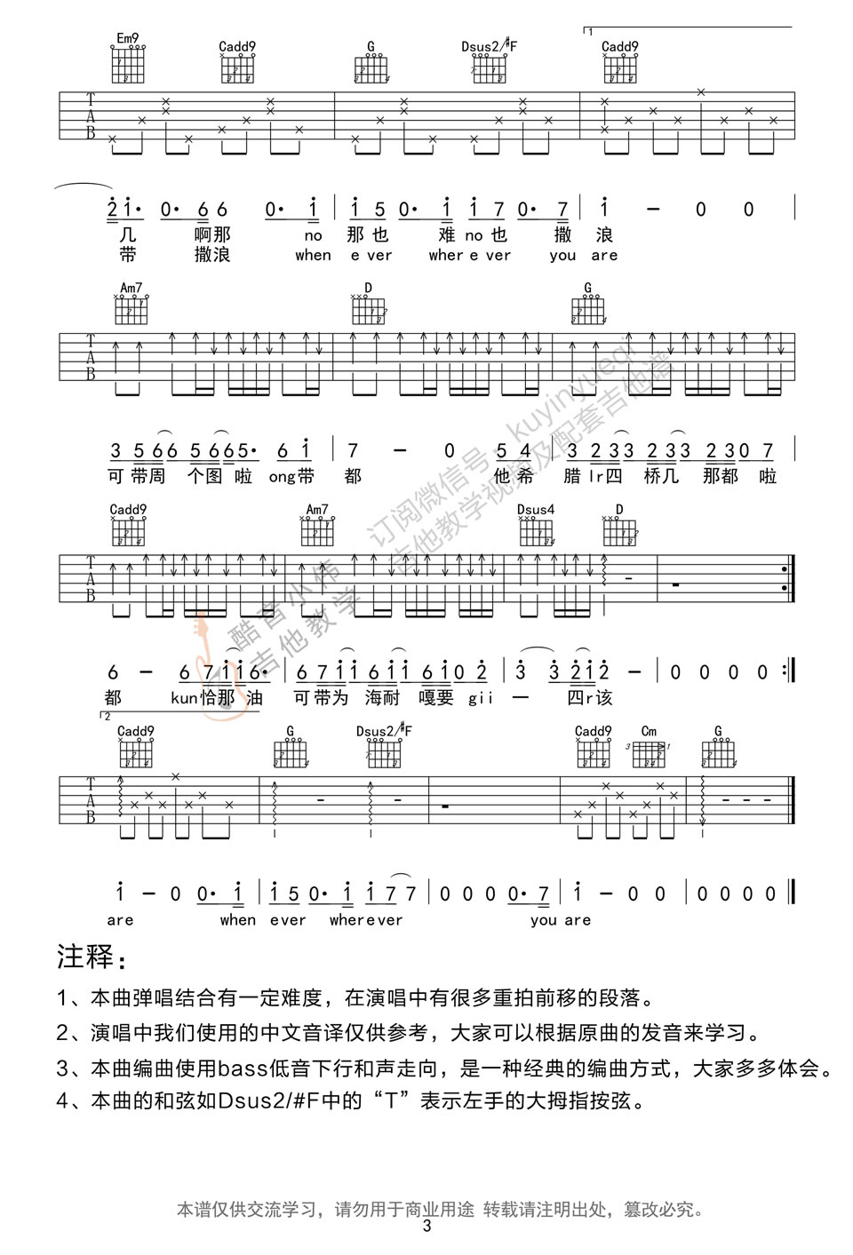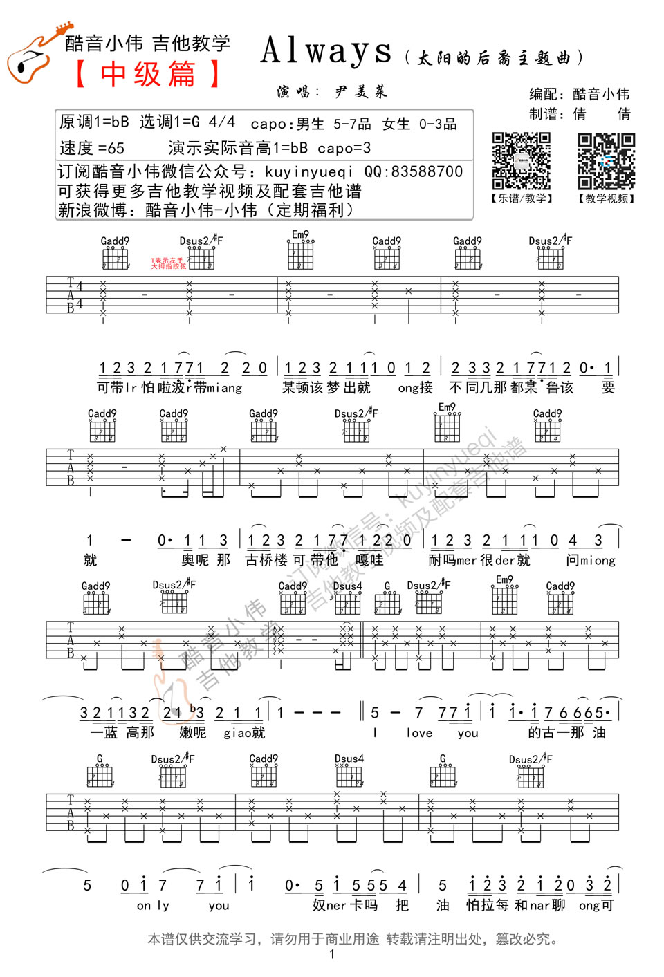 曲谱介绍: 太阳的后裔主题曲,尹美莱演唱的Always吉他谱,原调bB,选调G,男生变调夹5-7品,女生0-3品,Always吉他六线谱,感谢酷音小伟编配,并提供吉他弹唱教学,演示实际音高是bB调,Capo夹三品。歌曲弹唱结合有一定难度,在演唱中有很多重拍前移的段落, 具体琴友们参照视频讲解。