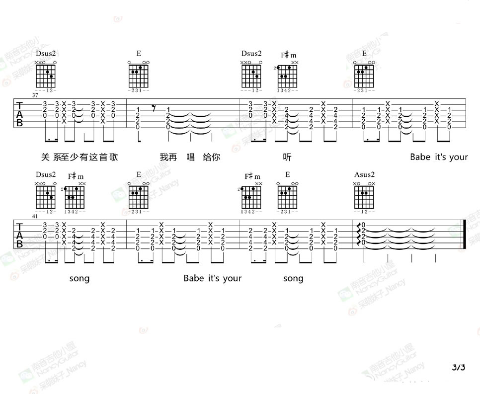 曲谱介绍: 鹿晗致爱Your Song吉他谱,男生标准调音,女生CAPO3-5品。致爱Your Song六线谱中,X代表打板,代表品格的数字是可以忽略的,只看和弦图就可以了。主要是打板+附点节奏。感谢Nancy编配制谱并提供这首鹿晗的歌曲吉他弹唱教学。