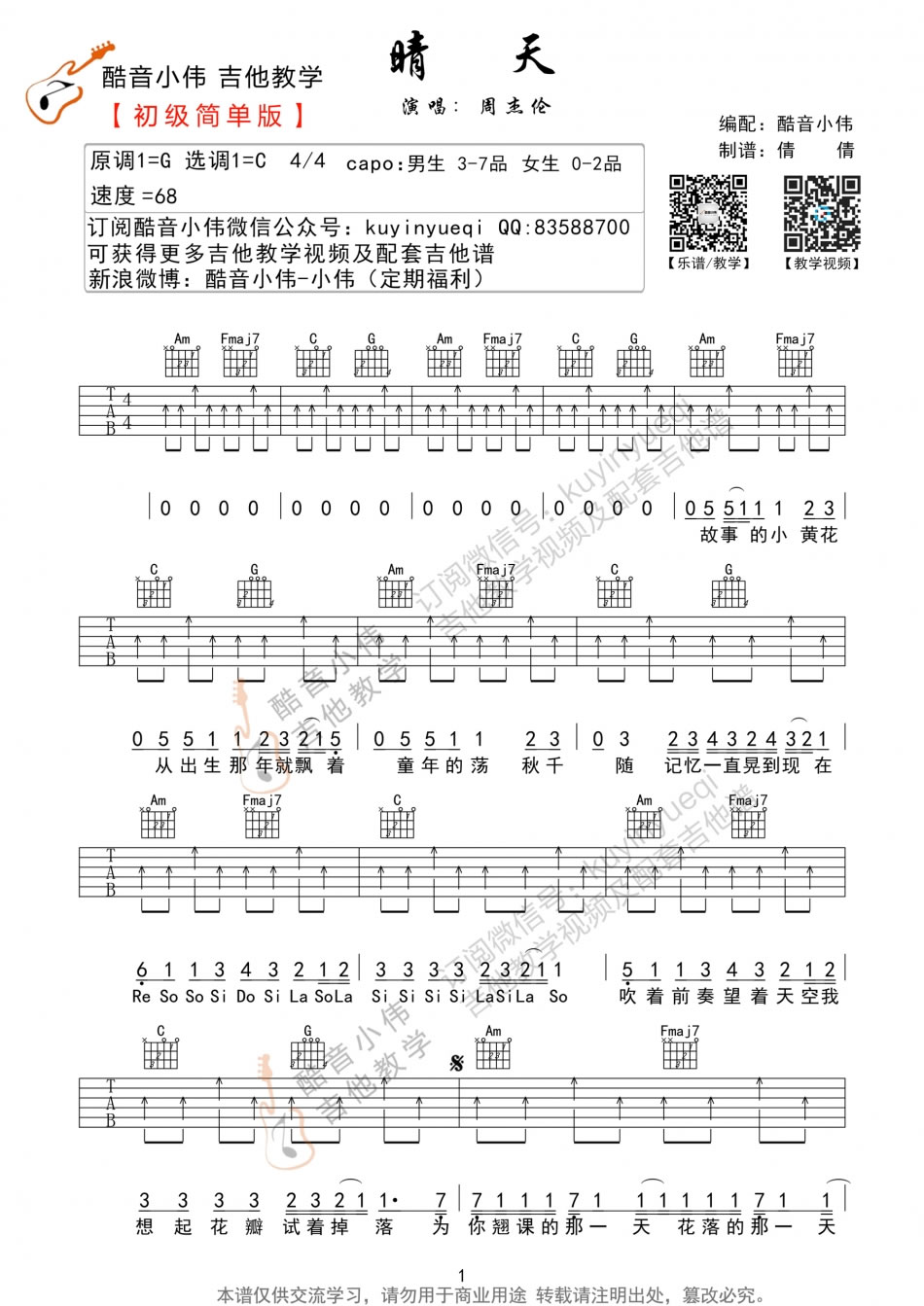 曲谱介绍: 周杰伦晴天吉他谱,初级简单版,原调G选调C,男生变调夹夹3-7品,女生0-3品,晴天吉他六线谱,三张图片谱例。一听到晴天 简单爱 安静…这些老歌就想起以前躲在被子里听磁带的日子,那么多年没怎么听过的歌,节奏一起还是可以清楚的唱出歌词,青春的记忆。感谢酷音小伟编配倩倩制谱。