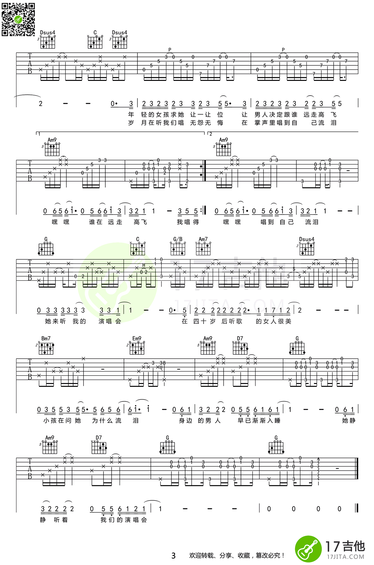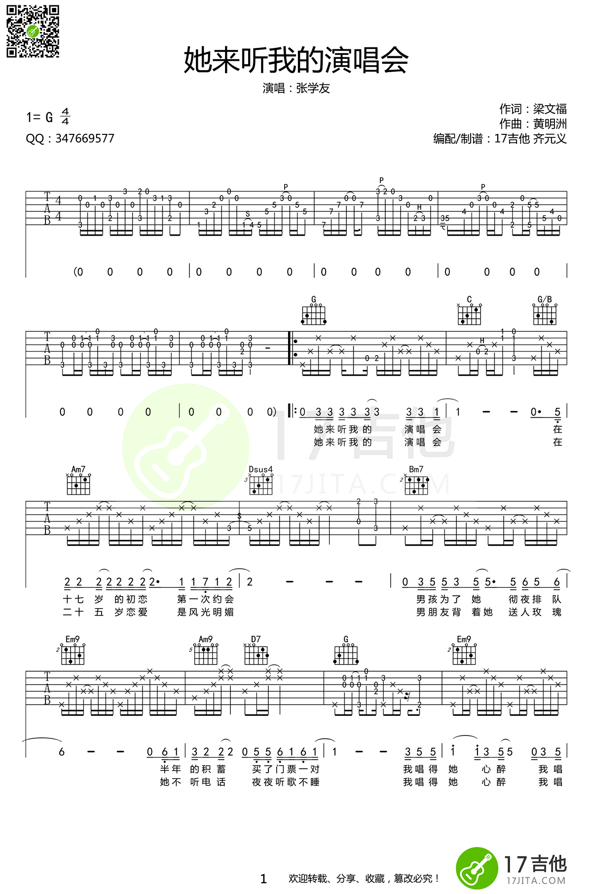 曲谱介绍: 她来听我的演唱会吉他谱,张学友演唱的一首经典歌曲,G调指法六线谱编配,她来听我的演唱会吉他弹唱谱,高清图片谱。歌曲短短五分钟内,唱出曲中“她”一生中最精华的三十年,唱出岁月的故事,唱出心中的情愫。在不同的年龄来听,大概会有不同的感慨。岁月在听我们唱无怨无悔,不管苦与乐都是人生的一部分。