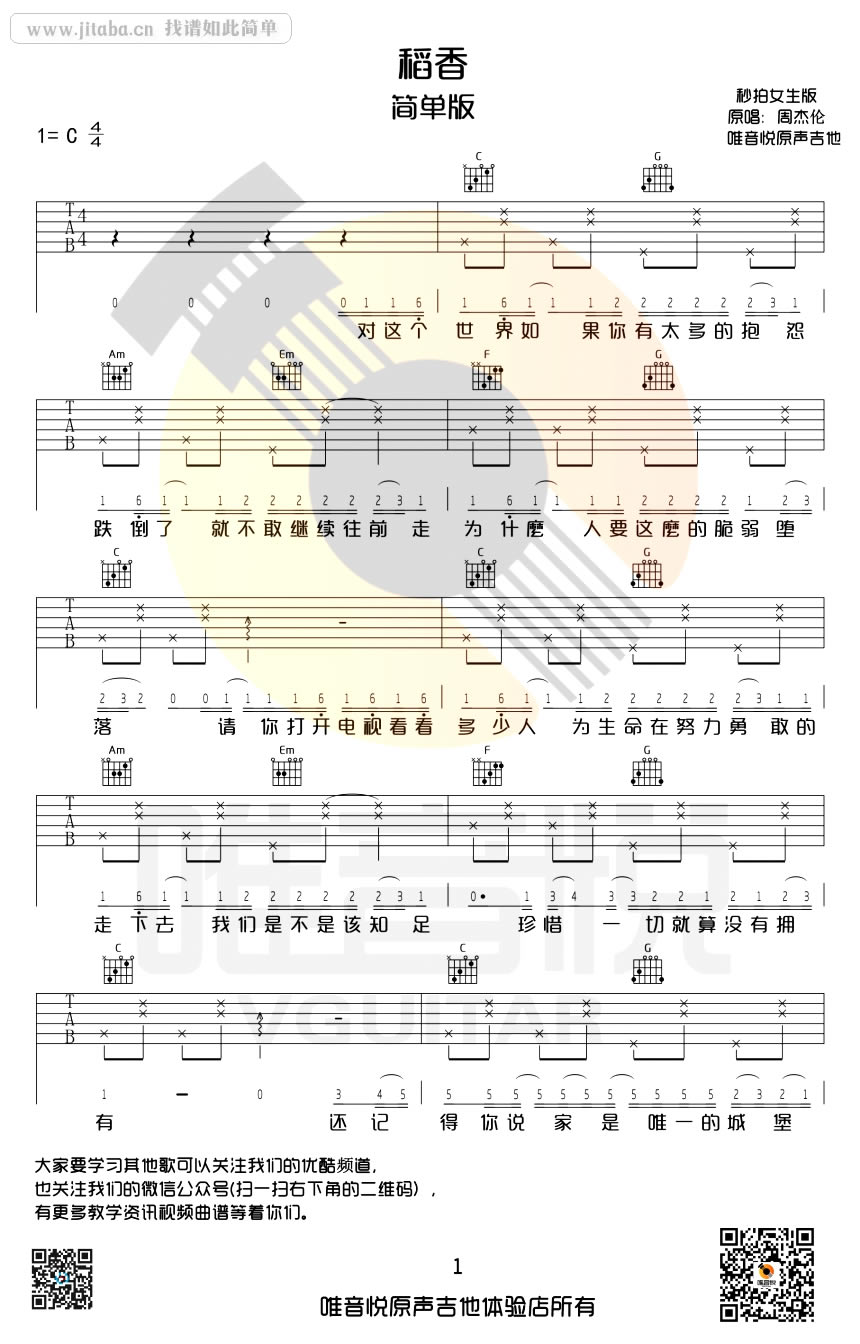 曲谱介绍: 周杰伦稻香吉他谱简单版,C调指法编配,根据秒拍女生版改编,稻香吉他六线谱,图片谱三张。一首励志的歌曲,唱出了家的温暖,以及所追求的那种单纯却又充实的幸福生活。