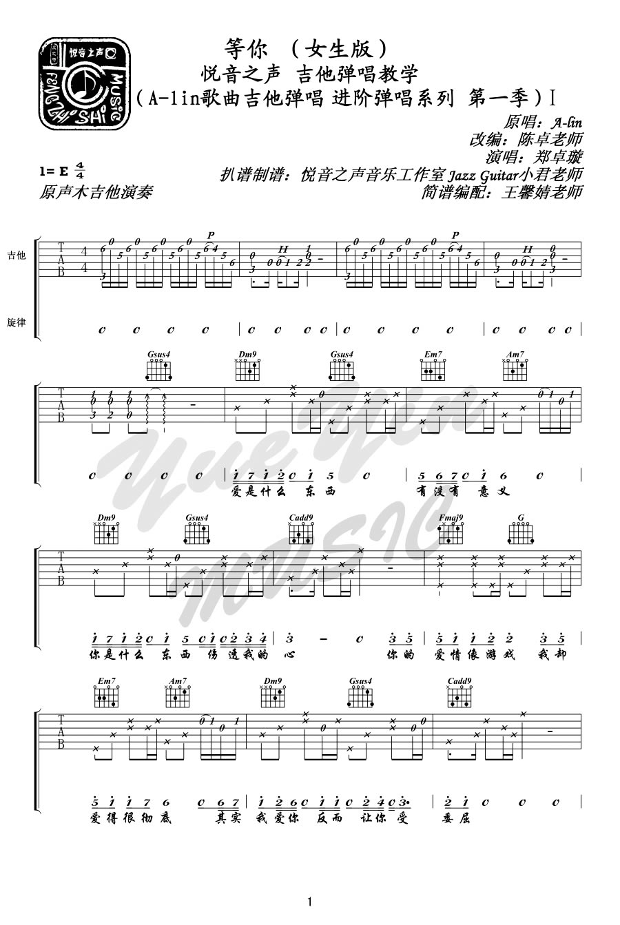 曲谱介绍: A-Lin等你吉他谱,女生版吉他弹唱谱,黄丽玲《等你》吉他六线谱,感谢悦音之声陈卓老师改编,扒谱制作小君老师,简谱编配王馨婧老师。歌曲前奏部分请多熟悉原曲以便更容易把握节奏,歌曲和弦比较多,左手换的比较频繁需要大家多多练习,整首歌曲演唱注意感层层递进的情表达,具体弹奏大家认真参考下方的《等你》吉他弹唱教学视频。