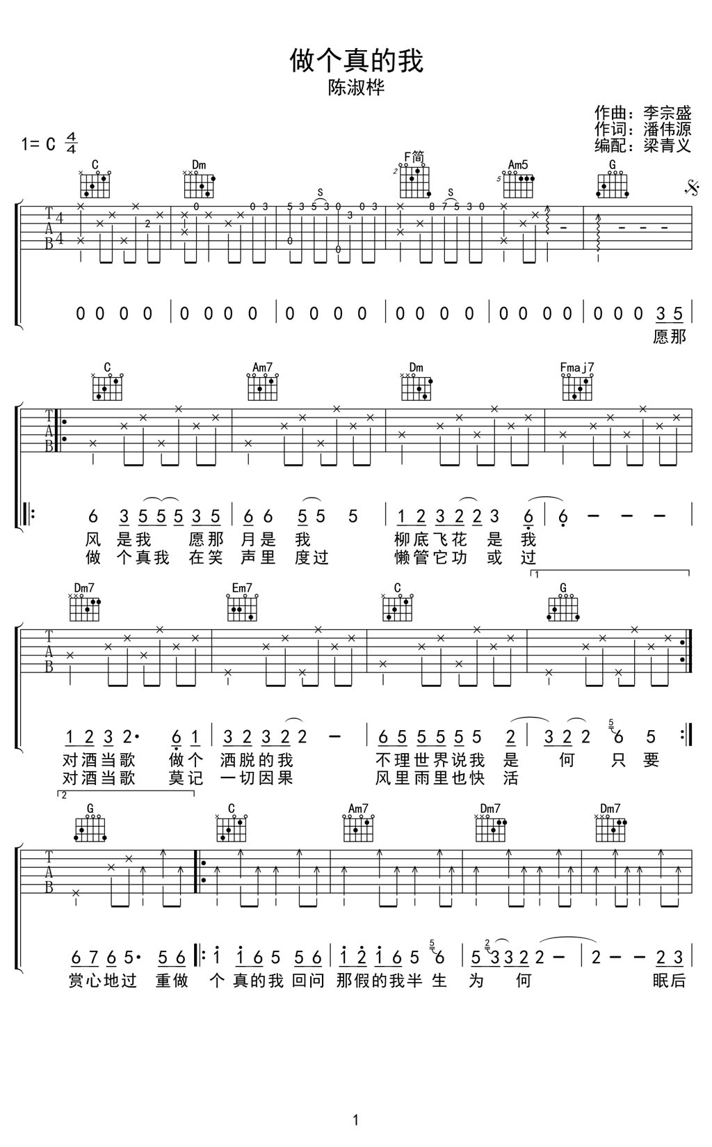 曲谱介绍: 陈淑桦 做个真的我吉他谱,C调指法编配,做个真的我六线谱,电影《东方不败之风云再起》粤方版的插曲,国语版就是大家熟悉的陈淑桦的《笑红尘》。一首经典的武侠中国风歌曲,唱出一种浮生若梦,为欢几何的洒脱人生观,不管是哪个版本的歌词都很潇洒。曲谱为高清图片谱格式,由梁青义编配。