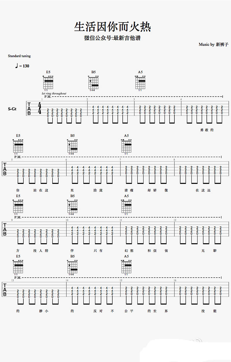 曲谱介绍: 新裤子乐队《生活因你而火热》吉他谱,六线谱编配,生活因你而火热吉他弹唱谱,完整版共五张图片谱例。忘了吧那摇滚乐,那奔腾不复的时代,曾经的理想主义叛逃者,还是被社会无情的淹没,当情怀和幻想都不在,新裤子与乐迷一起勇敢面对无聊的现实,认真的活着。那平淡如水的生活,因为你而火热;歌曲献给都市角落中无声的游魂们,那些昙花一现的灿烂。感谢最新吉他谱分享。