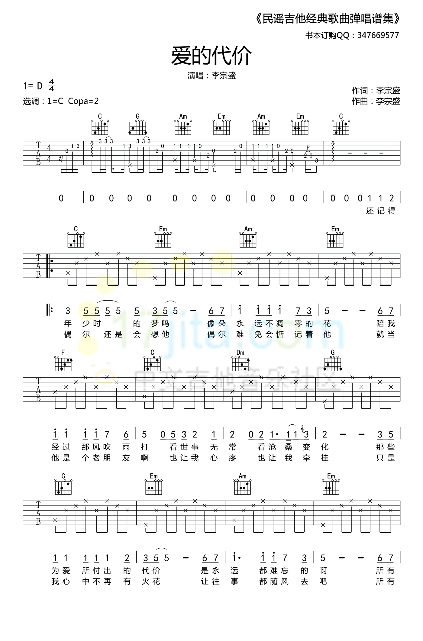 曲谱介绍: 李宗盛爱的代价吉他谱,原调D,选调C,变调夹CAPO夹二品。爱的代价吉他弹唱图片谱,六线谱高清版,曲谱收录在《民谣吉他经典歌曲弹唱谱集》。张艾嘉唱出的是回忆,李宗盛唱的是感慨,梁咏琪唱的是向往。一首《爱的代价》唱出了人生的沧桑变化,听者动容,经历者神伤。