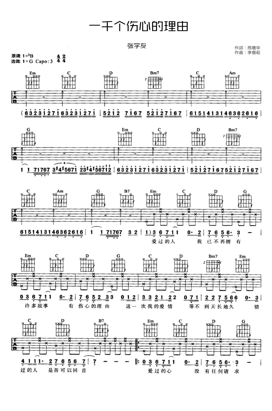 曲谱介绍: 张学友一千个伤心的理由吉他谱,原调降B调,选用G调指法弹奏,Capo夹三品位置。一千个伤心的理由六线谱,图片谱格式,曾经耳熟能详的经典情歌,如今依旧牵绊着我们的思绪,那些曾经刻苦铭心的记忆,随着吉他弹唱重新萦绕我们的心里。吉他谱网站推荐收藏。