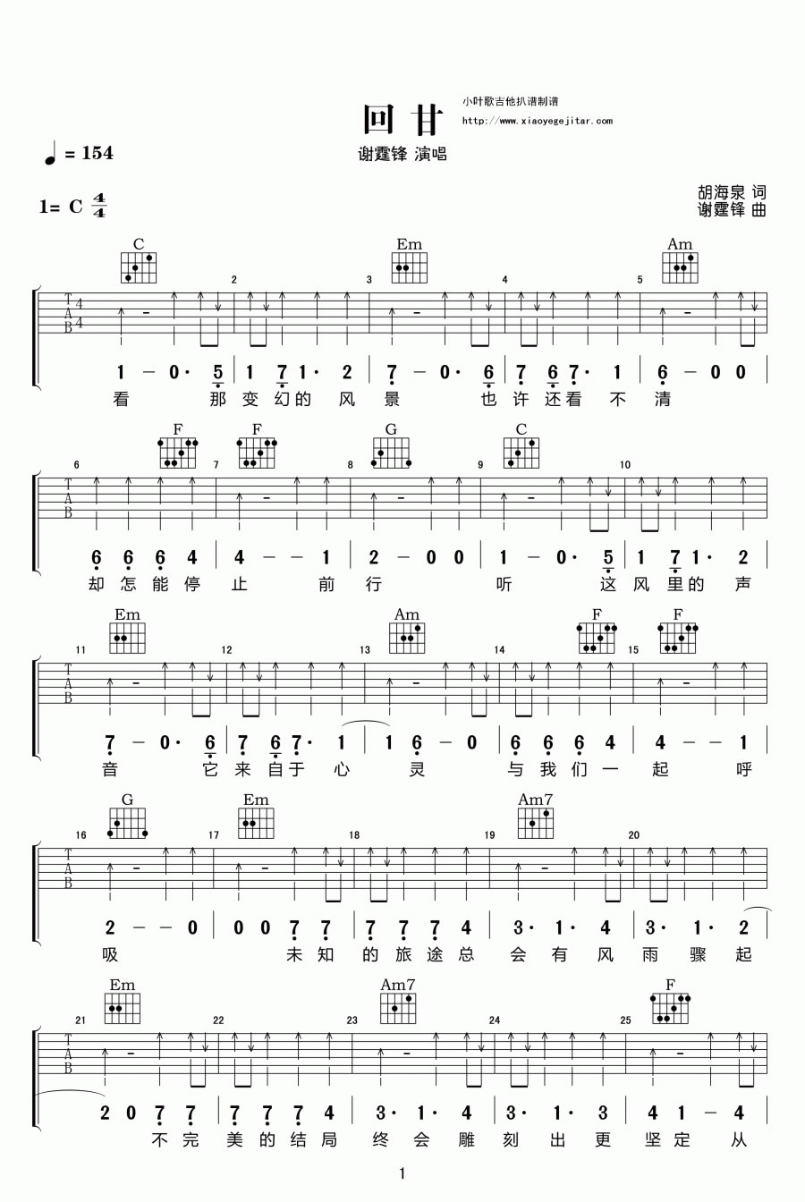 回甘吉他谱 - 谢霆锋 - C调吉他弹唱谱