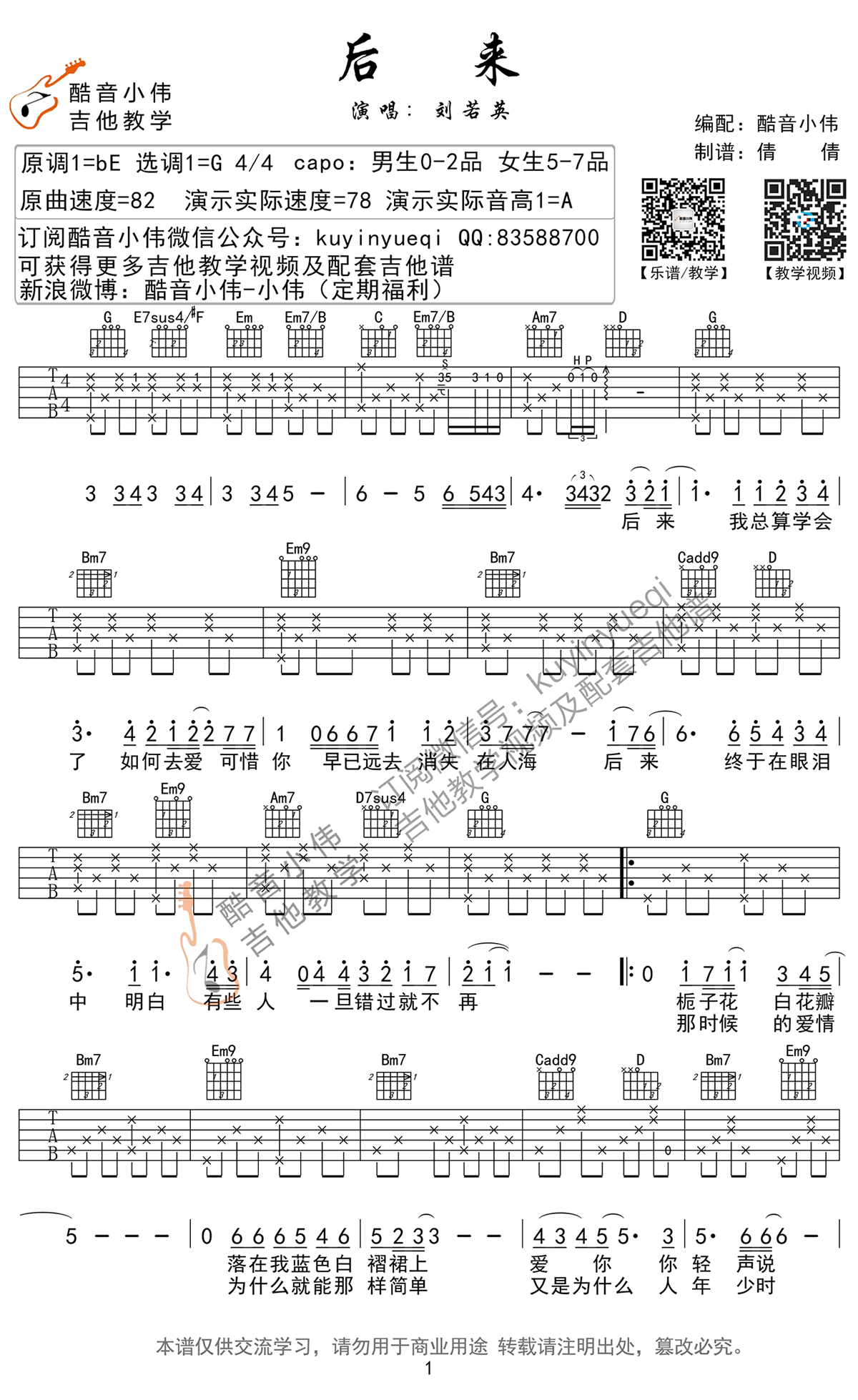 曲谱介绍: 刘若英后来吉他谱,精编带前奏间奏尾奏版本,后来吉他六线谱,高清图片谱,原调bE选调G,变调夹男生0-2品,女生5-7品,原曲速度82,后来吉他弹唱教学视频中演示速度78,演示实际音高A。前奏和间奏较难,大家可以分小节练习。感谢酷音小伟编配分享,琴友们可以关注酷音小伟老师的微信公众号得到更多吉他教学资料。刘若英经典歌曲吉他弹唱教学收藏。