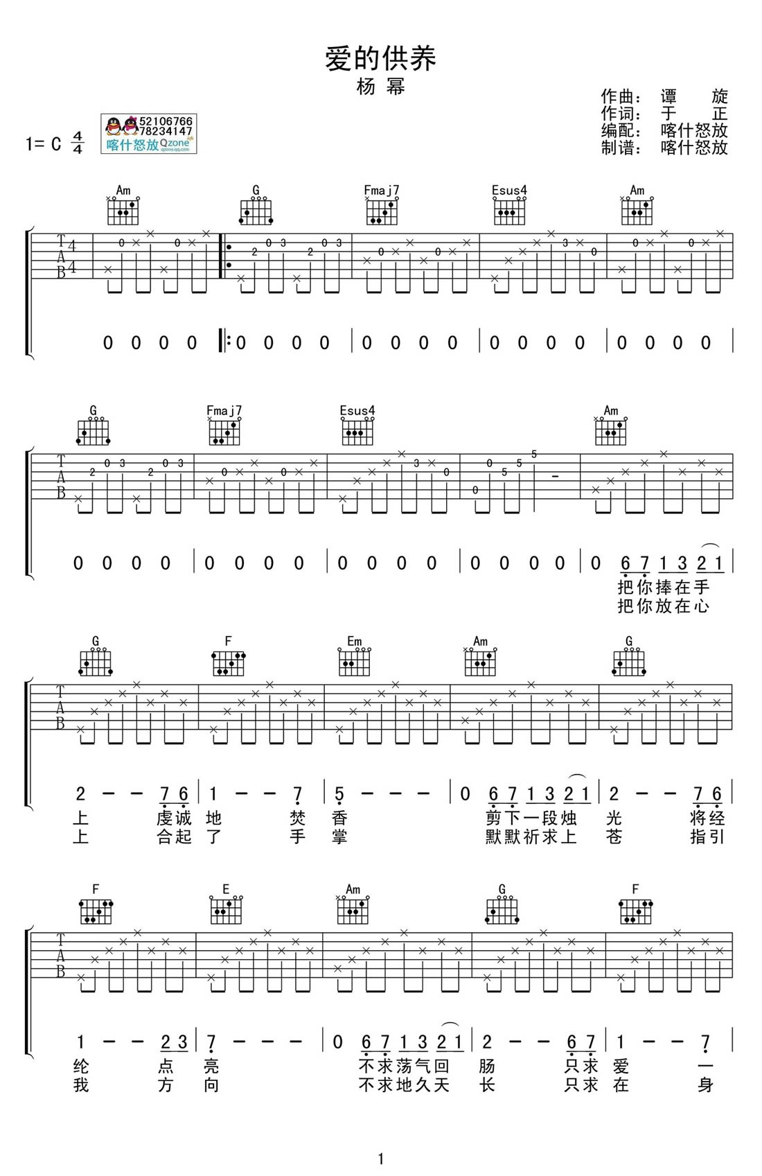 曲谱介绍: 杨幂《爱的供养》吉他谱,C调六线谱,完整图片谱高清版,爱的供养吉他弹唱谱,感谢喀什怒放吉他编配分享。电视剧《宫》主题曲,曲调动人心弦,温柔细腻歌声唱出感人肺腑的真挚爱情。