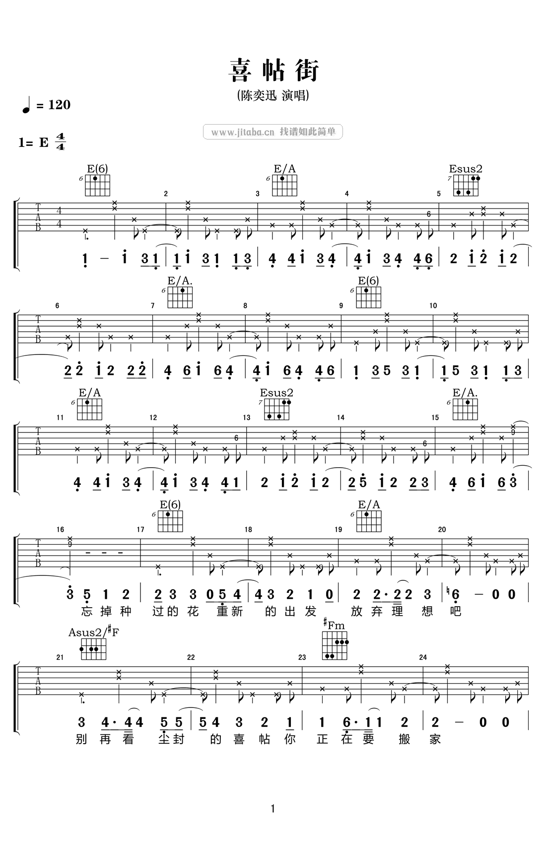 曲谱介绍: 陈奕迅的喜帖街吉他谱,E调指法编配,喜帖街吉他弹唱谱,六线谱图片格式。《喜帖街》是一首充满香港怀旧情怀的粤语歌曲,唱出了爱情的逝去和世事无常的变化。歌曲原唱谢安琪,陈奕迅演唱会现场演绎,配着卢凯彤淡淡的吉他伴奏,黯哑沧桑很有质感的声音,有着不同的味道和风格。