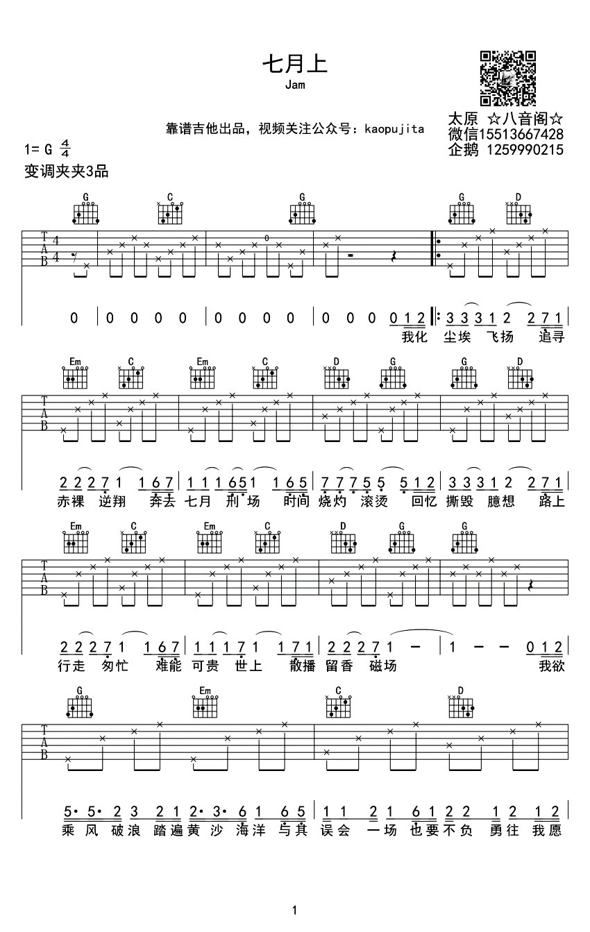 七月上吉他谱 - JAM - G调吉他弹唱谱