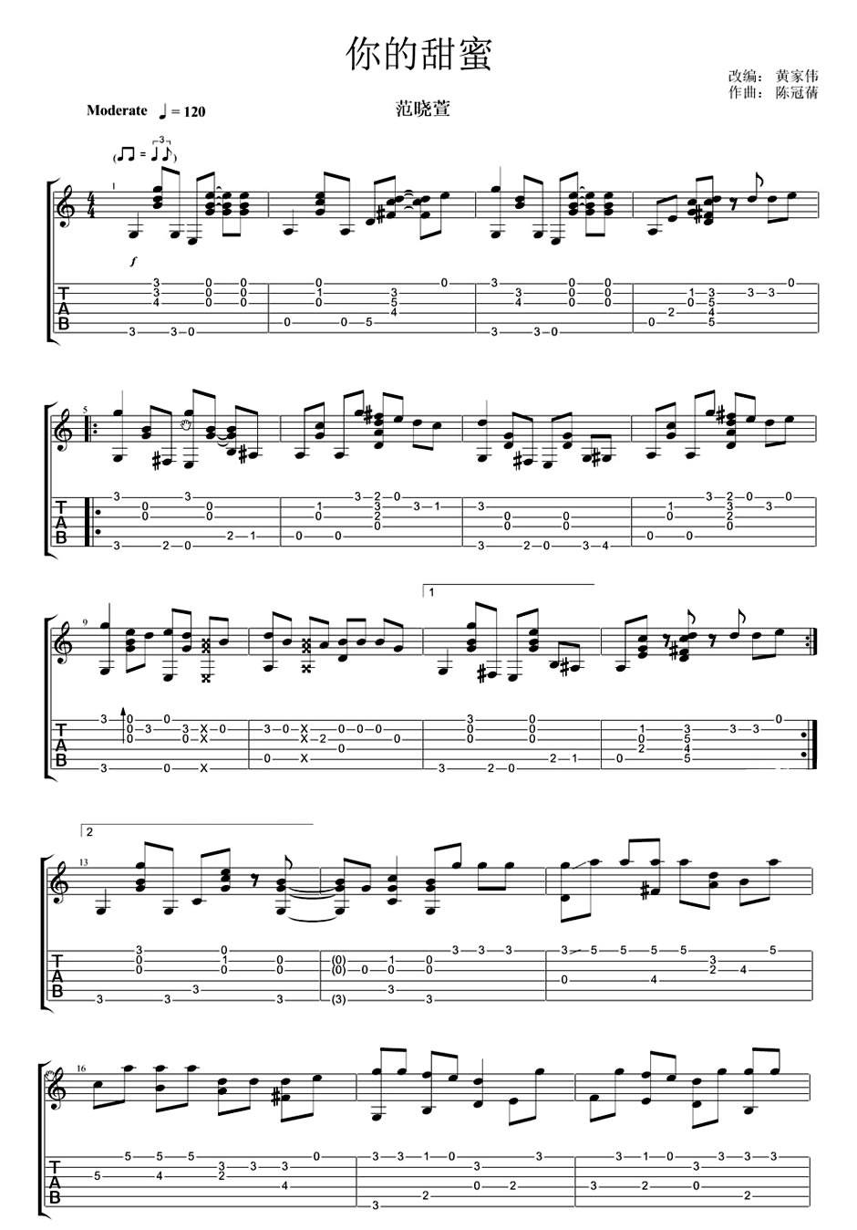 曲谱介绍: 范晓萱你的甜蜜吉他谱,你的甜蜜吉他六线谱,两张图片谱例。这是首快乐的情歌,曲调轻快俏皮,唱出可爱小女生的甜蜜。