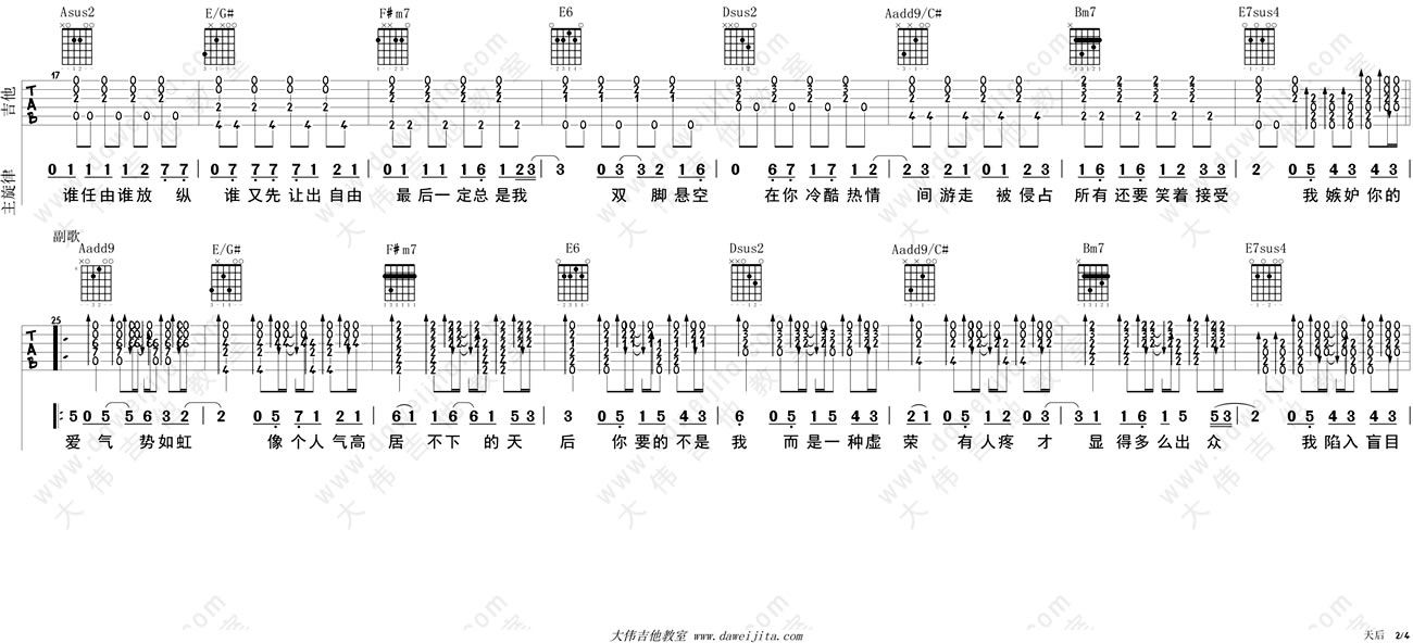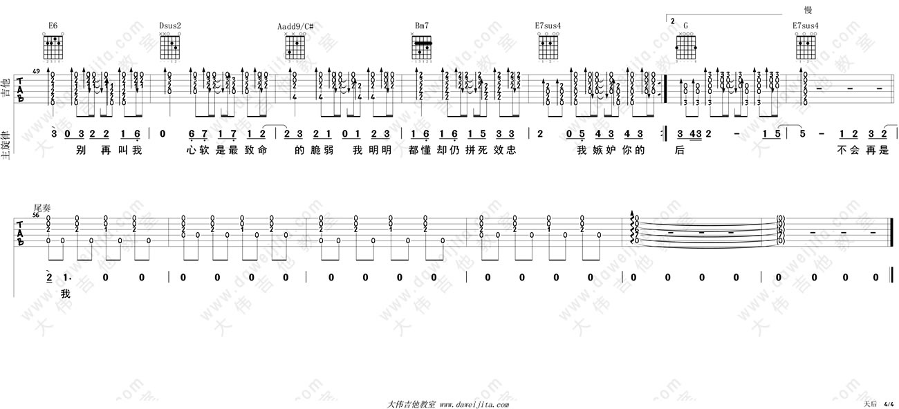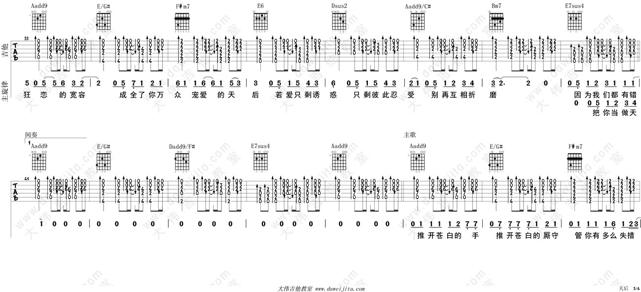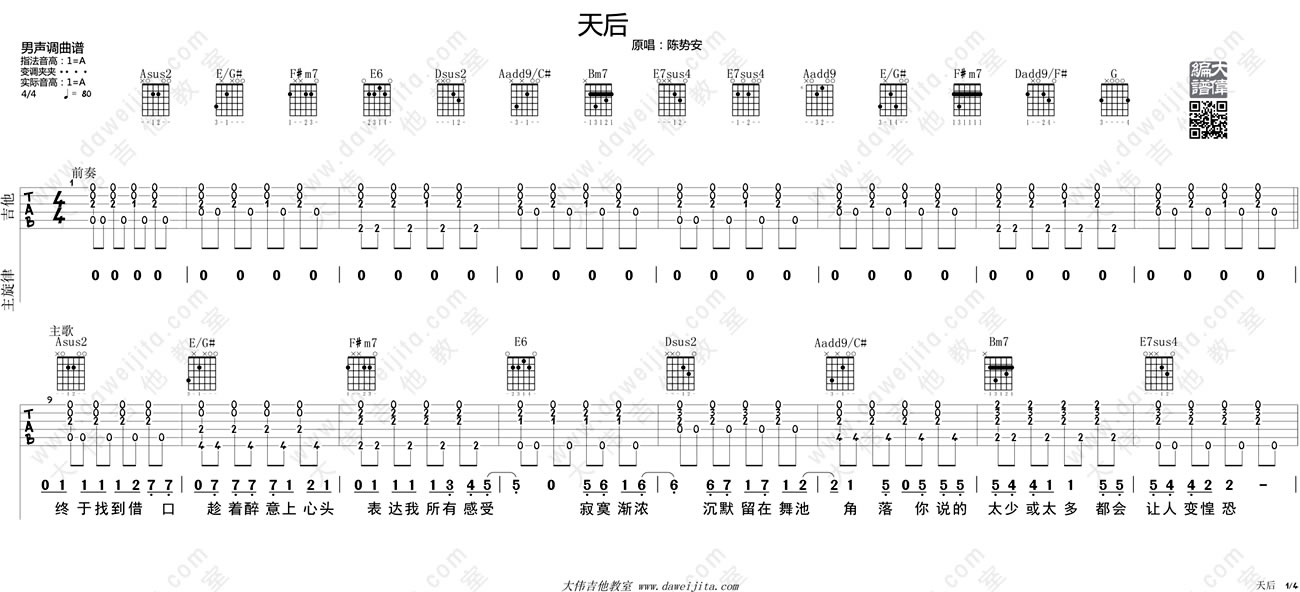 曲谱介绍: 陈势安天后吉他谱,男生调曲谱,吉他指法音高A调,实际音高A调,没有用变调夹。一首《天后》唱出面对爱情时候的内心纠结和心痛。天后吉他六线谱,四张图片谱,感谢大伟吉他编配分享,并为琴友们提供优质的吉他弹唱教学讲解。