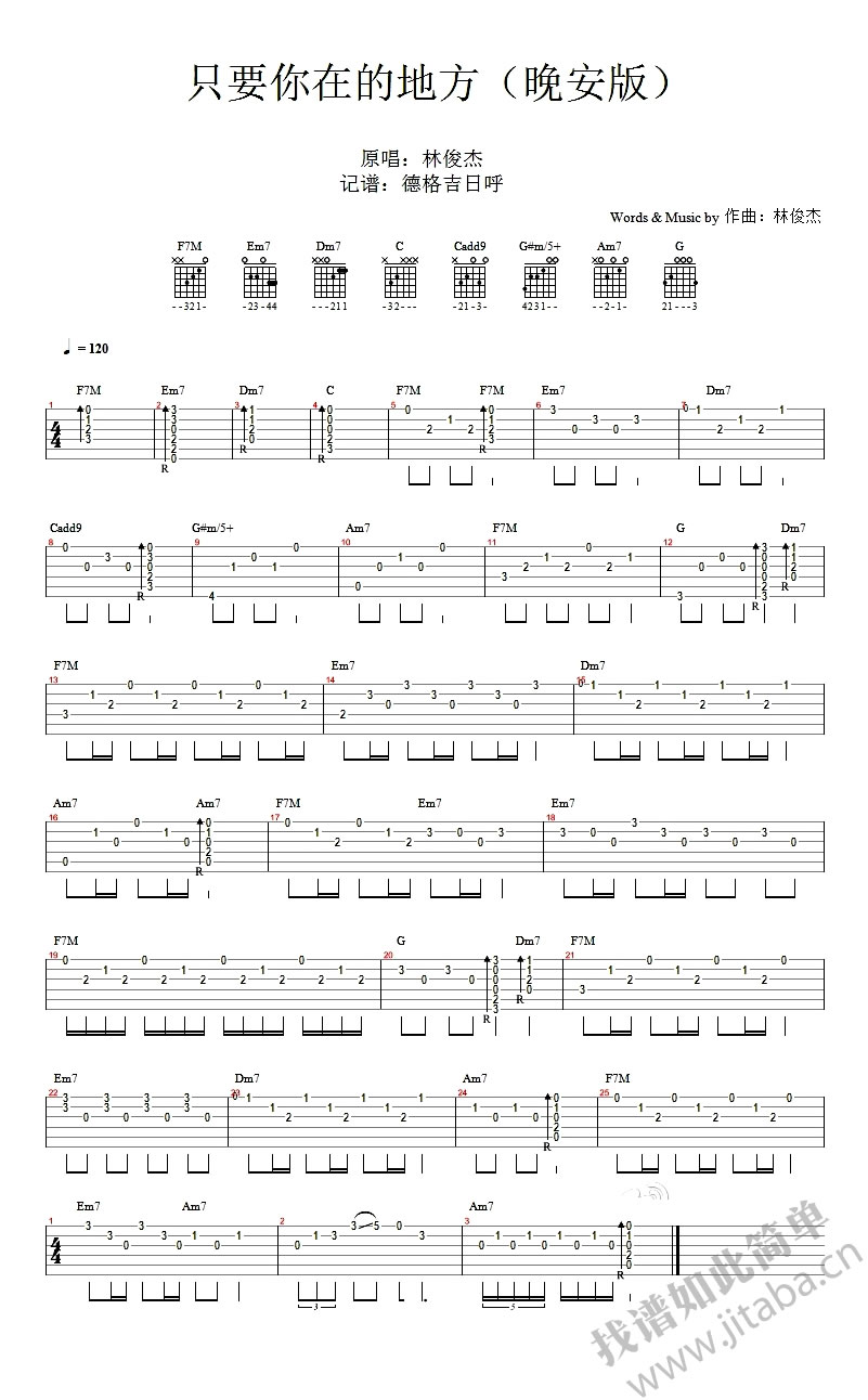 曲谱介绍: 只要有你的地方吉他谱,林俊杰和林夕为电影《消失的爱人》打造的主题曲,《只要有你的地方(晚安版)》A段吉他谱,感谢德格吉日呼扒谱编配,曲谱弹奏整体听觉上和录影带差不多,歌曲B段的时候用A段的和弦扫弦就可以了,整曲最后几小节是分解和弦。吉他的轻弹让心都静了下来,仿佛带我们回到了从前,不想醒来。