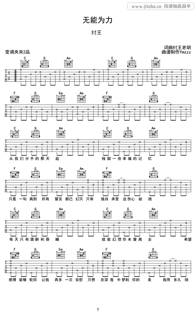 曲谱介绍: 无能为力吉他谱,纣王老胡词曲,无能为力六线谱编配,变调夹夹第2品,图片谱制作Ymzzz。送给大家这首好听的歌曲,也许只有伤心情歌才更真切贴近生活。