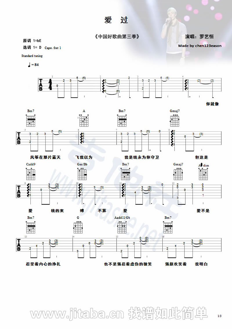 曲谱介绍: 罗艺恒爱过吉他谱,中国好歌曲第三季《爱过》吉他谱,原调bE,选调D,Capo夹1品。感谢chen123eason扒谱,三张图片谱。来自新西兰的帅哥罗艺恒创作的歌曲《爱过》,送给琴友们。