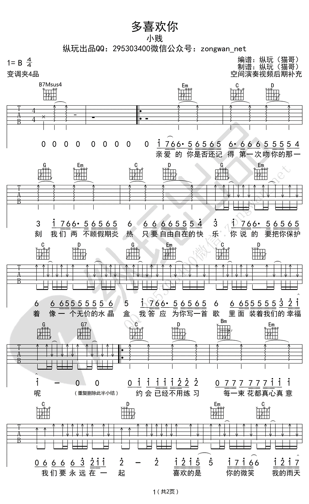 曲谱介绍: 小贱多喜欢你吉他谱,B调变调夹夹4品,多喜欢你吉他六线谱,高清版图片谱,感谢纵玩猫哥编谱制作。好听的一首歌,旋律很美,第一次听就让人喜欢,唱出憧憬的爱情和简单的幸福,一首温暖、微妙的歌曲送给自己。小贱歌曲谱《多喜欢你》吉他弹唱曲谱推荐分享。