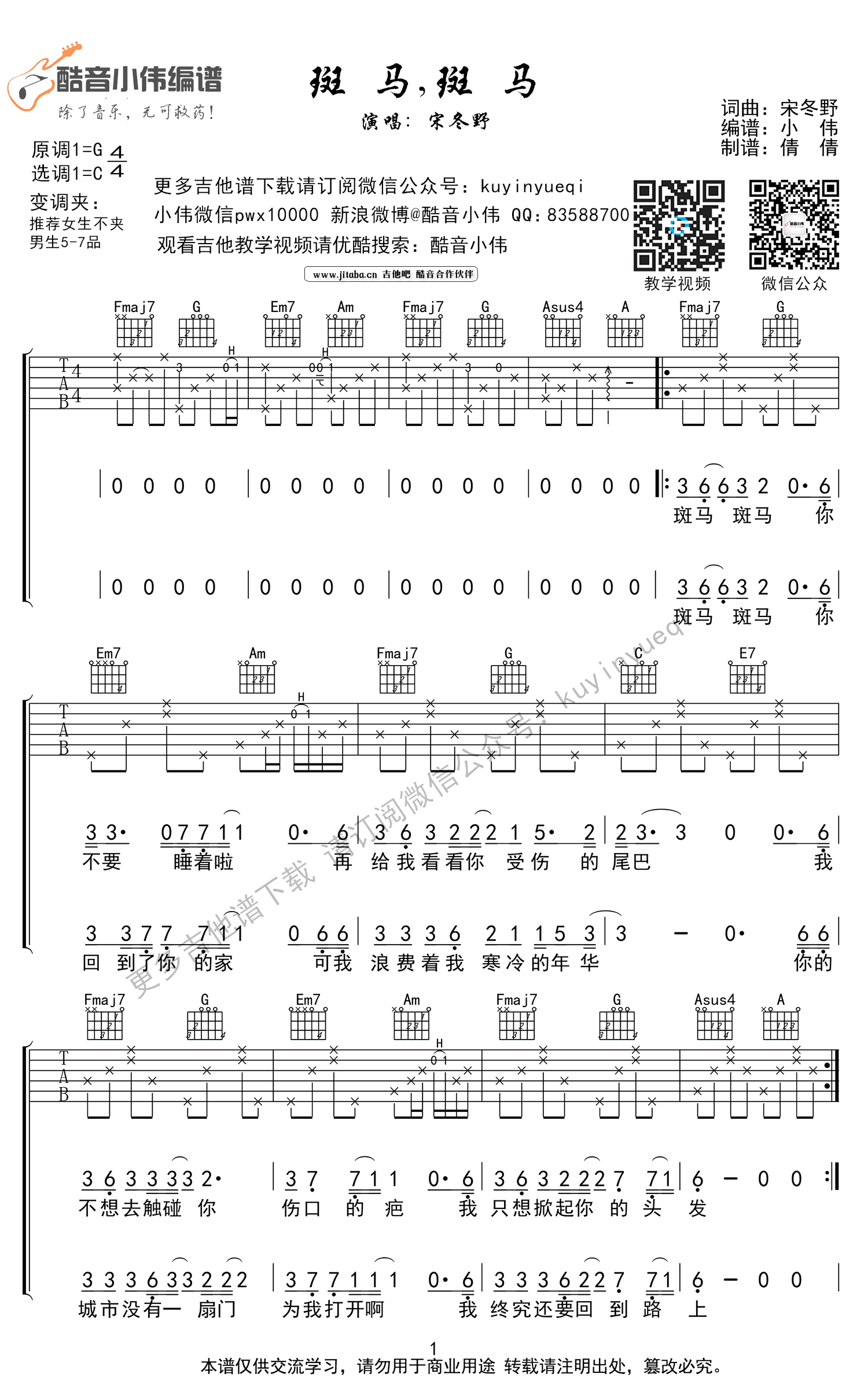 曲谱介绍: 斑马斑马吉他谱,好听而简单的吉他弹唱谱,原调G调选调C调,女生推荐不夹变调夹,男生5-7品。斑马斑马吉他六线谱,高清图片谱。宋冬野的经典民谣,讲述的是一个流浪者爱情的故事,充满了恋人之间深沉的情感,低声浅浅吟唱的歌声里,不带一丝浓烈的起伏,却让人无比的落寞孤独。感谢酷音小伟编配分享。