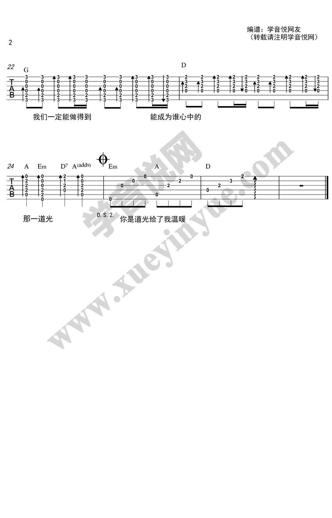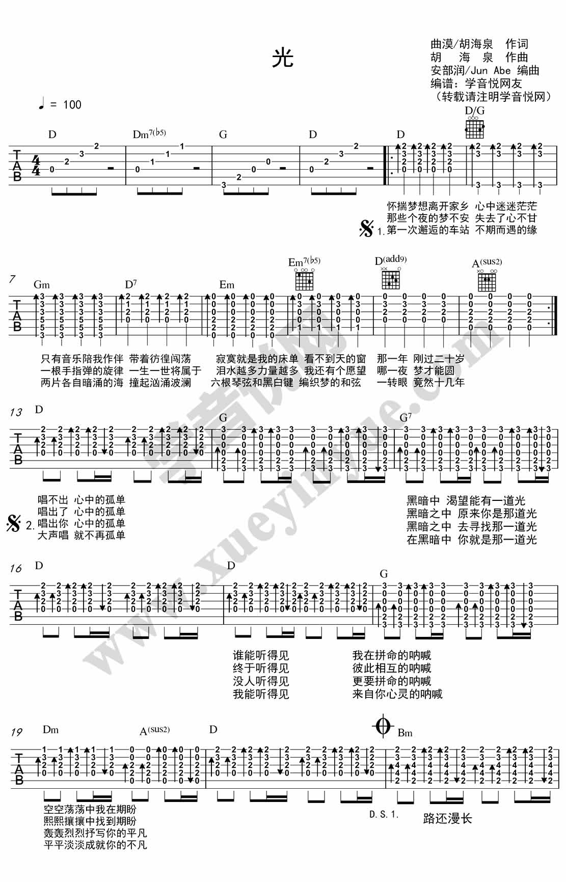 曲谱介绍: 羽泉光吉他谱,这首歌曲收录于羽泉新专辑《不服》中,《光》吉他六线谱,高清图片谱,大声唱,就不再孤单,在黑暗之中,你就是那一道光。感谢学音悦网编谱分享。