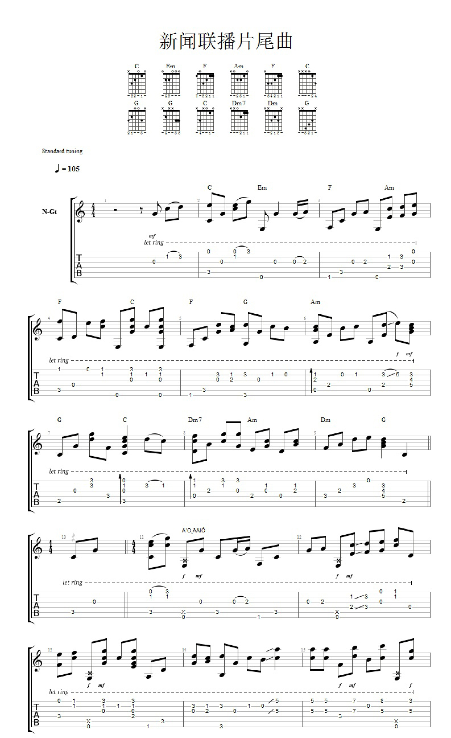 曲谱介绍: 中央电视台新闻联播结尾曲背景音乐吉他谱,独奏曲谱。