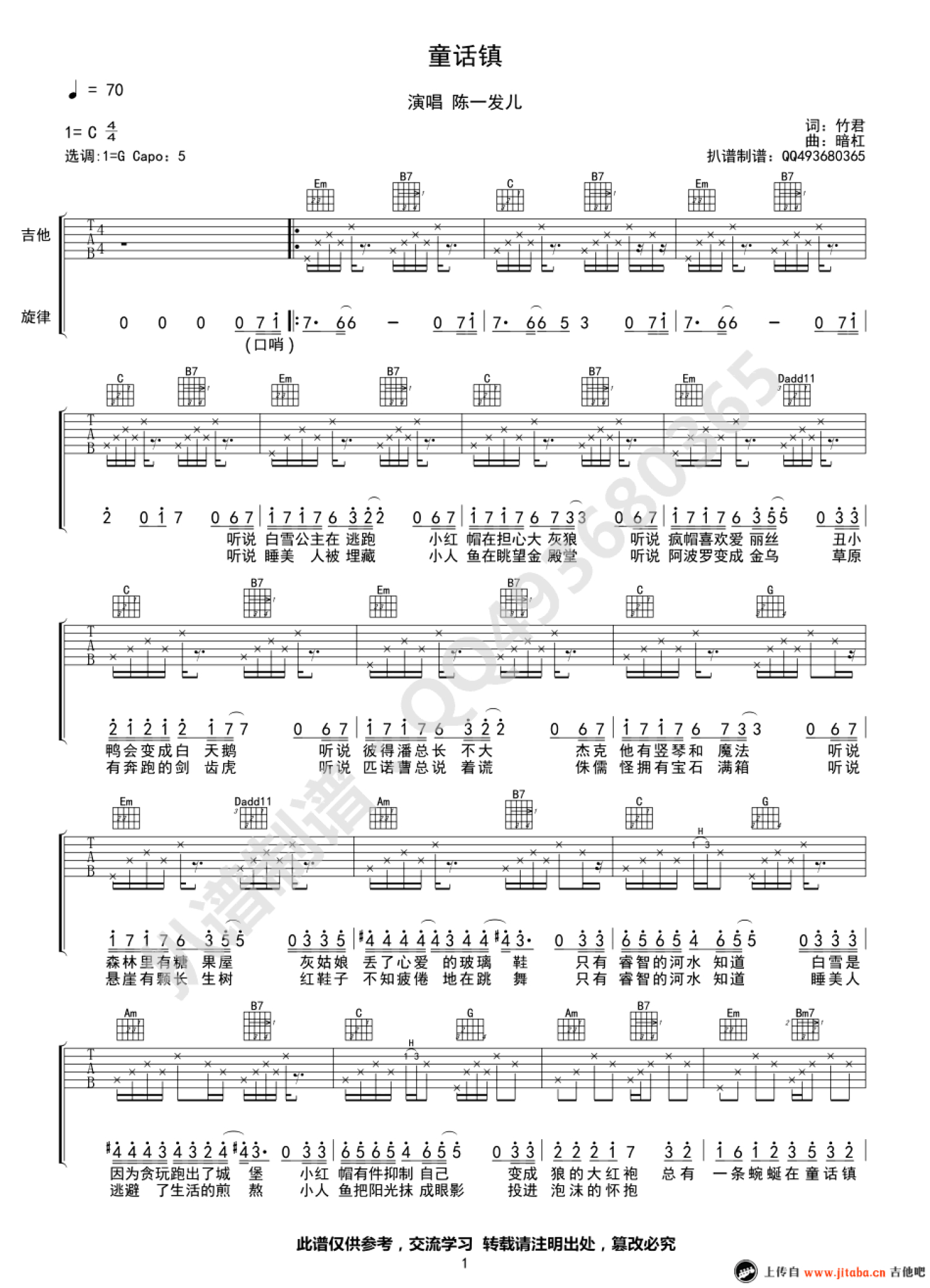 曲谱介绍: 陈一发儿《童话镇》吉他谱,原调C,选调G,变调夹夹五品。一首节奏轻快、非常好听的《童话镇》,来自斗鱼直播的发姐陈一发儿。“总有一条蜿蜒在童话镇里七彩的河,分隔了理想分隔现实又在前方的山口会合。”歌声中带着一股温暖的魔力,不断的涤荡着心灵,仿佛带我们进入了一个又一个神奇的童话世界。或许在某一个瞬间,似乎又回到了那单纯又美好的时空。