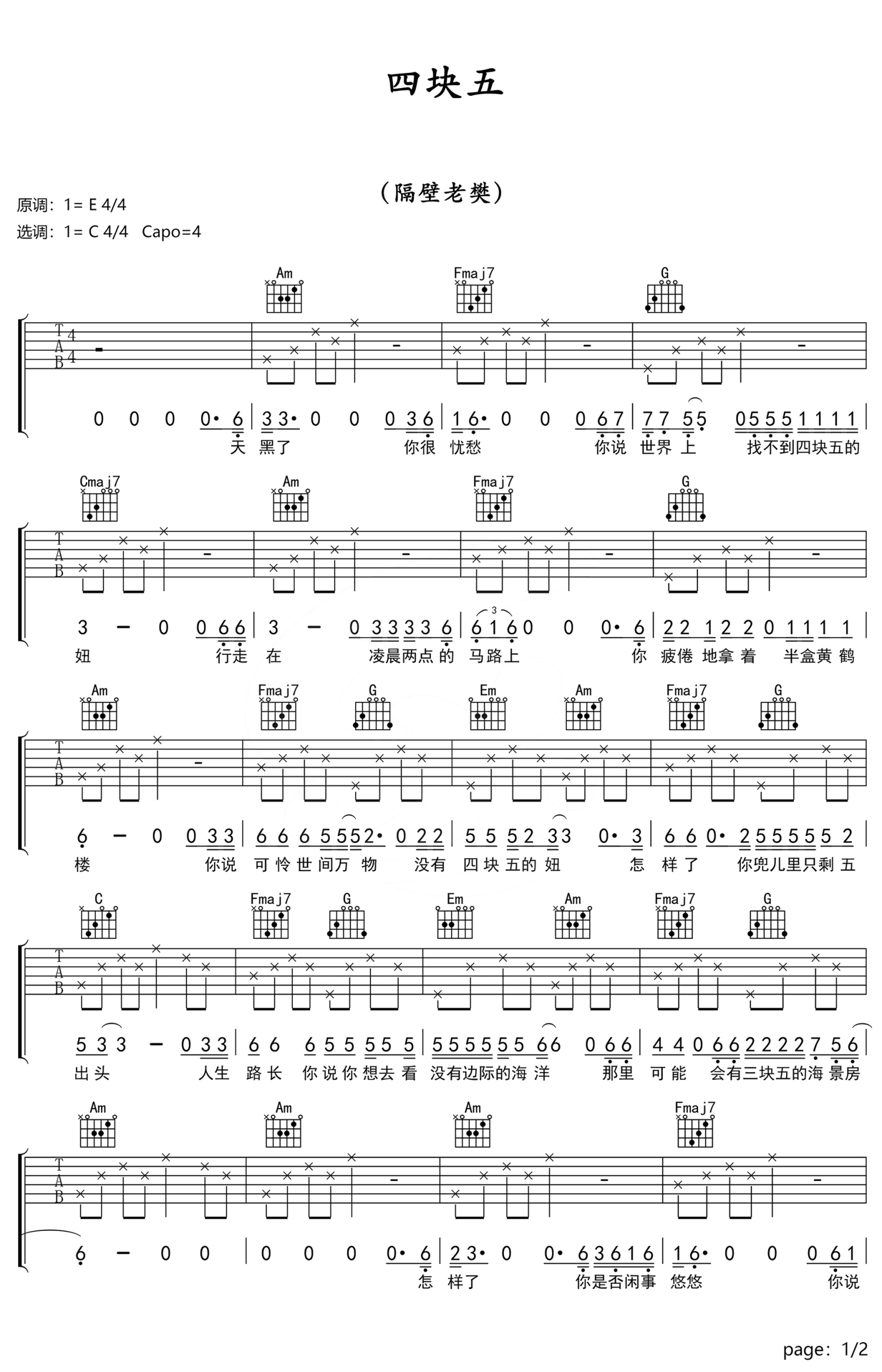 四块五吉他谱 - 隔壁老樊 - C调吉他弹唱谱