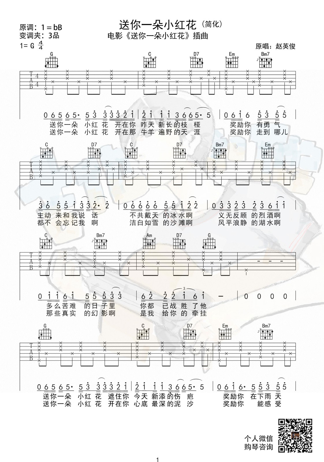 送你一朵小红花吉他谱 - 赵英俊 - G调吉他弹唱谱