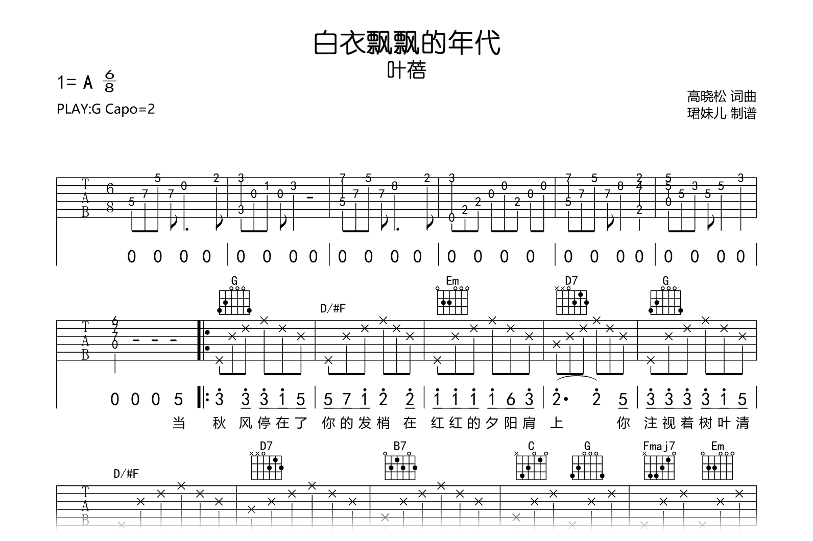 曲谱介绍: 白衣飘飘的年代吉他谱,叶蓓演唱,高晓松的一首经典校园民谣,《白衣飘飘的年代》吉他弹唱谱,原调为A调,采用G调指法编配,建议变调夹2品,速度85BPM,演奏难度较简单容易上手。 《我们民谣2022》live现场,一首《白衣飘飘的年代》唱哭了民谣好友和听众。叶蓓的嗓音依旧干净透彻,唱出那些年纯洁真挚的感情,再次听也依然感动。