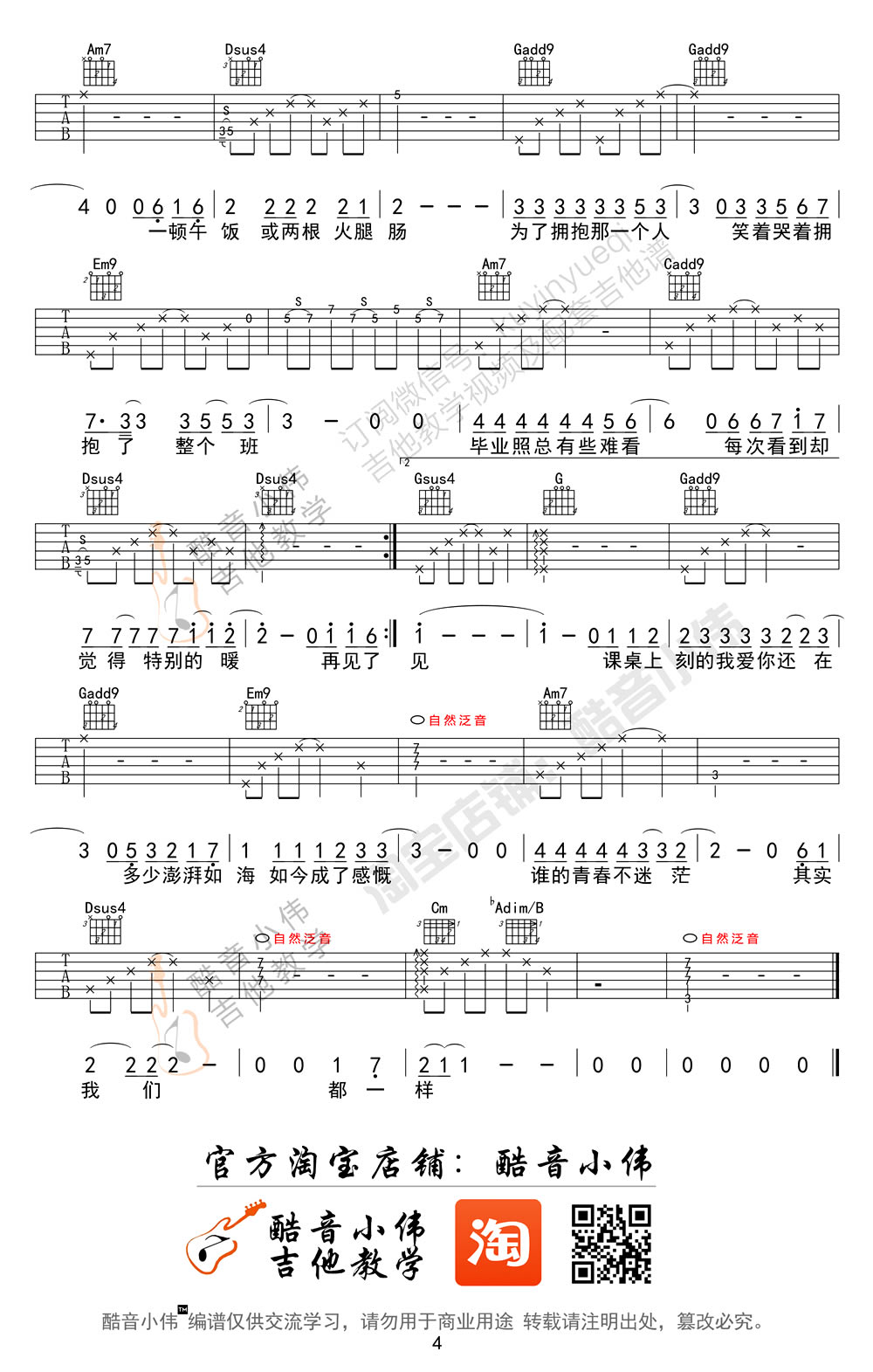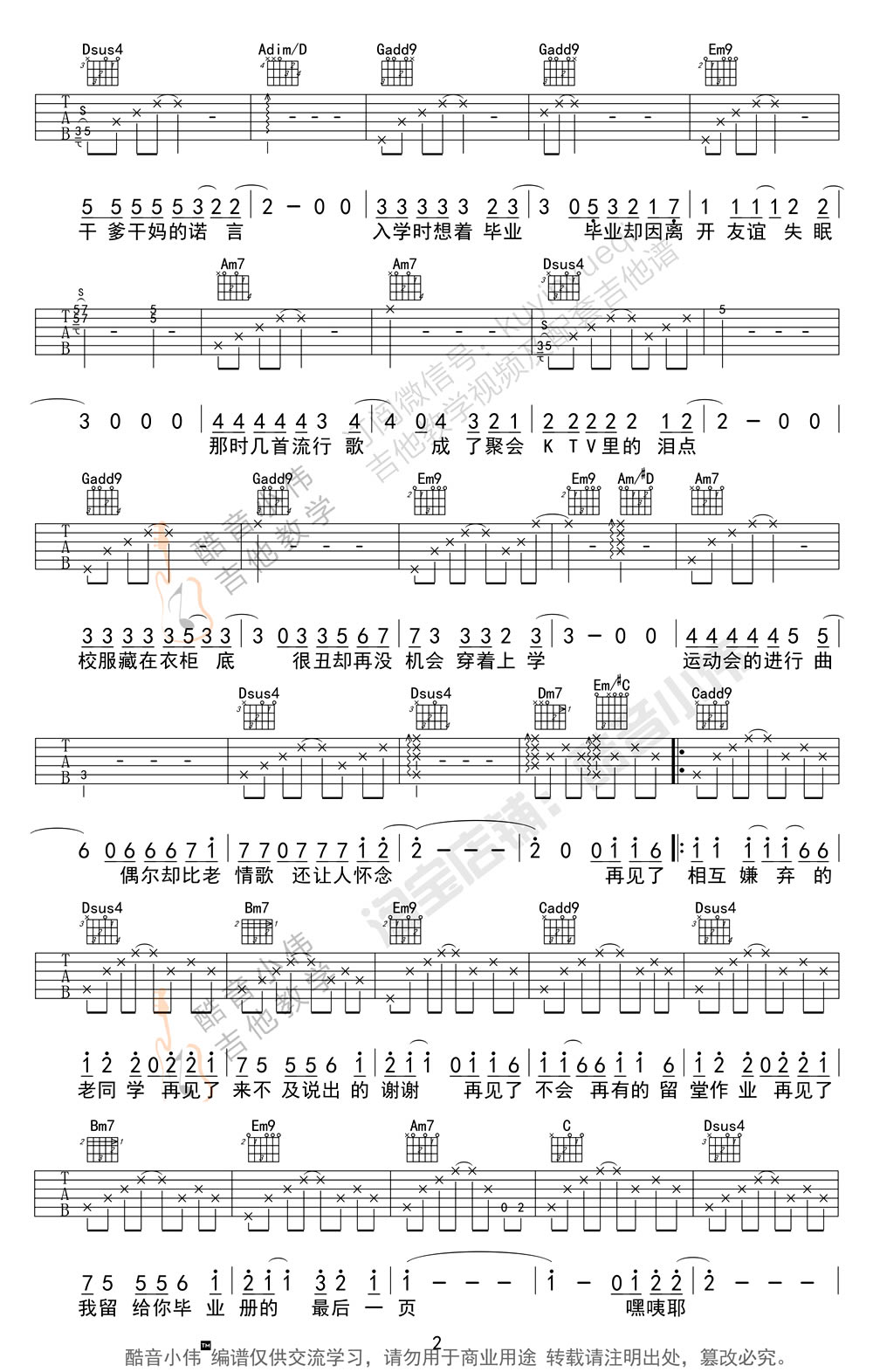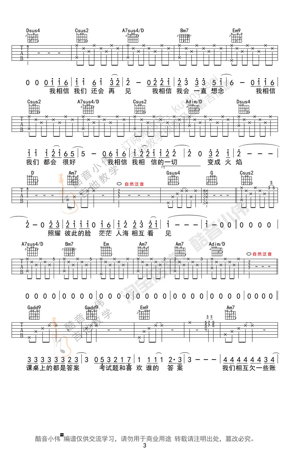 曲谱介绍: 不说再见吉他谱,许飞女生版本,六线谱四张高清图片谱例,原调bA选调G,capo男生4-7品,女生0-1品,《不说再见》吉他弹唱教学视频演示实际音高G,感谢酷音小伟编配,小虎哥制谱,舒丹演唱。歌曲为电影《谁的青春不迷茫》主题曲,喜欢好妹妹乐队演唱的琴友们也可以浏览91吉他谱网站为大家提供的男生弹唱版本。好妹妹乐队《不说再见》男生版的轻快的节奏不同,女生版许飞的浅斟低唱更有一份治愈的感染力。