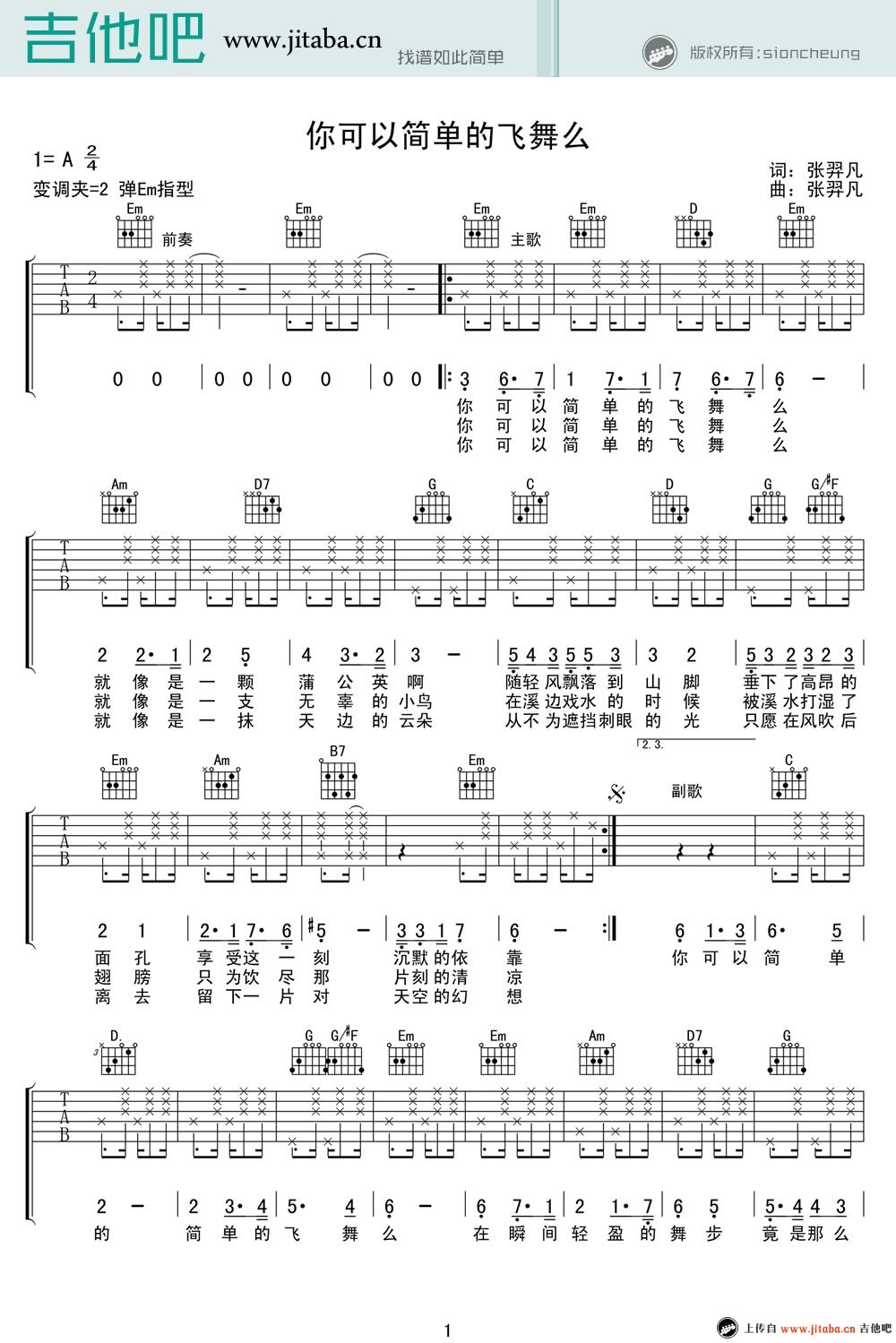 你可以简单的飞舞么吉他谱 - 张羿凡 - 吉他弹唱谱