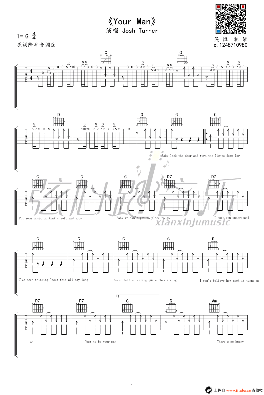 曲谱介绍: Your Man吉他谱,Josh Turner演唱,Your Man六线谱,G调,原调降半音调弦。美国乡村歌手乔什·特纳(Josh Turner)的这首蓝调风情的浪漫情歌,欧美磁性男声,诠释了一个男人简单的表白,歌词虽简单但却蕴藏着热情的暗示,迷人而不轻浮,很好听。
