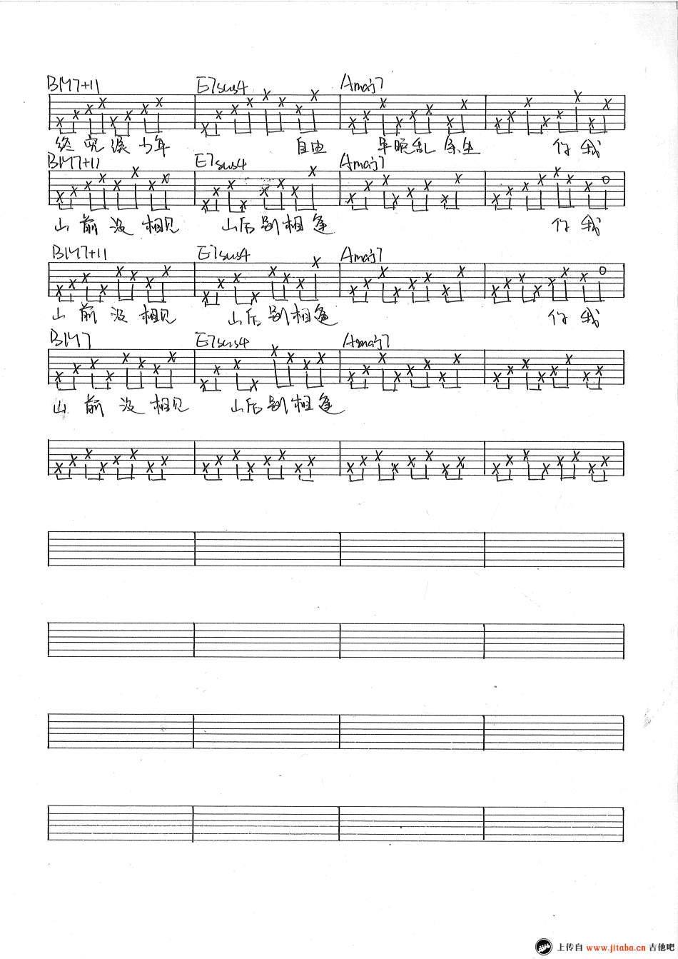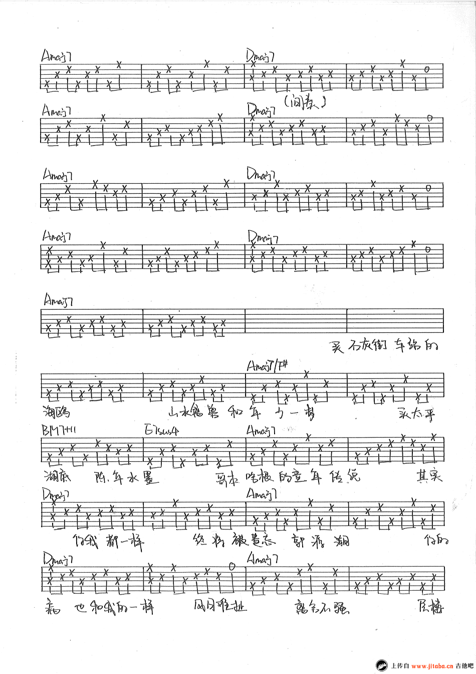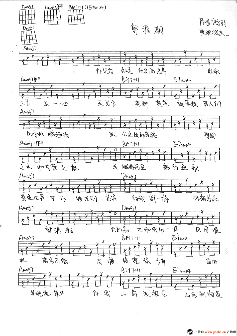 曲谱介绍: 宋冬野《郭源潮》吉他谱,六线谱手写版,感谢浅灰编配整理。宋冬野凌晨在微博上发了这一首歌,依旧是民谣曲风,还是熟悉的味道,歌名为《郭源潮》。不久前的风波,也许会让他的心境变得很复杂,歌词中“层楼终究误少年,自由早晚乱余生,你我山前没相见,山后别相逢 ”这一句,很有意味。 编配者:PS:和弦BM7+11和E7sus4这两个和弦按法其实是一样的,但是考虑到和弦本质还是写成两个名字,大家不要被和弦图部分长长的名字吓到。