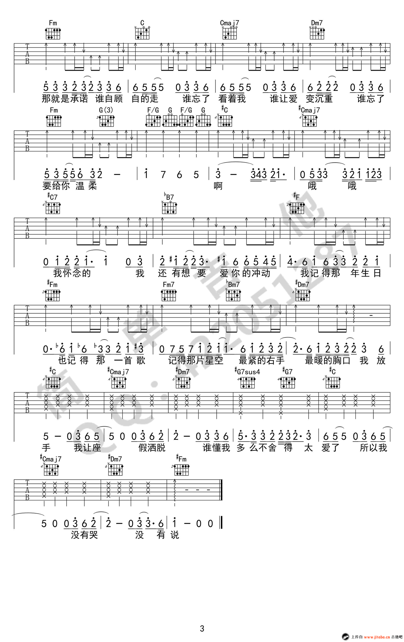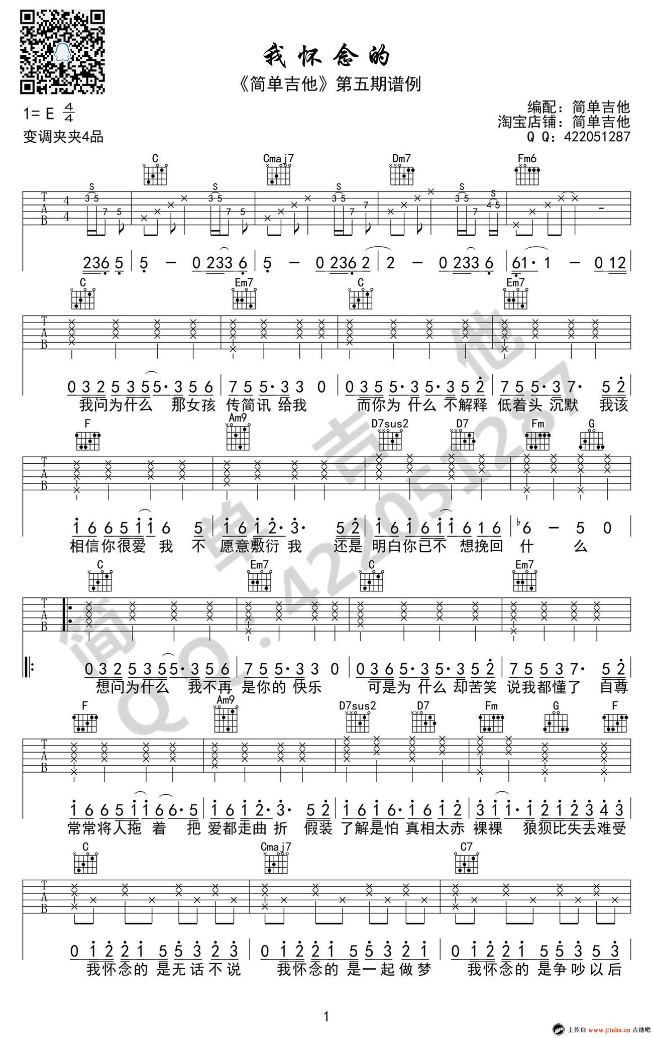曲谱介绍: 我怀念的吉他谱,孙燕姿演唱,我怀念的吉他六线谱,完美弹唱版,变调夹夹四品,简单吉他编配。曲谱为高清图片谱,三张谱例。07年孙燕姿一首《我怀念的》唤起很多人的回忆,简单的旋律,唱出那种对从前感情的怀念,对自己爱人的不舍,一种让人百转千回的心情。 91吉他谱推荐相关曲谱:林俊杰《我怀念的》吉他谱