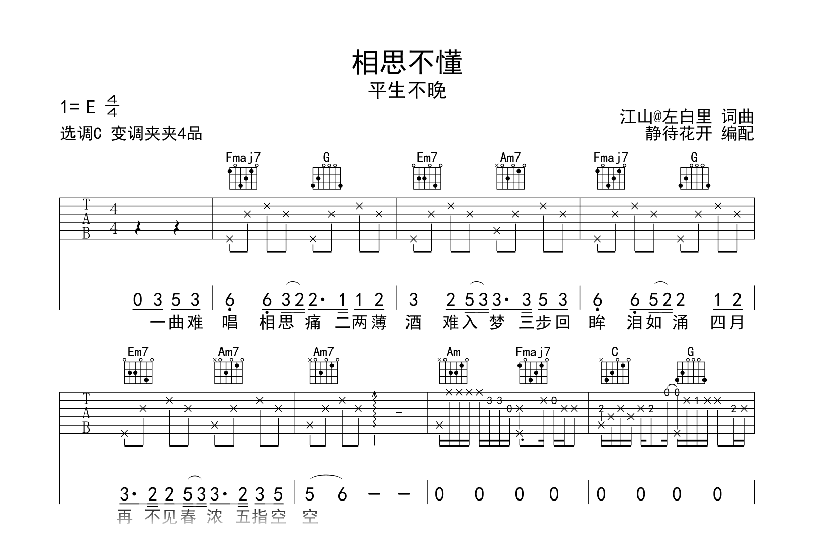 曲谱介绍: 平生不晚《相思不懂》吉他弹唱谱,采用C调指法编配,共有2张高清图谱,免翻页排版设计。