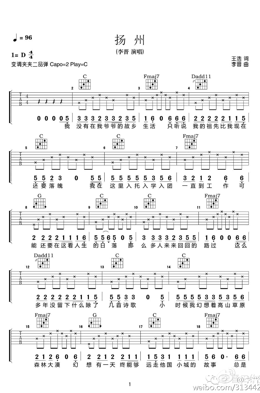 曲谱介绍: 扬州吉他谱,李晋词曲创作演唱,选用C调指法编配,CAPO2品。曲谱为李晋提供分享,完整版共五张图片谱,91吉他谱为琴友们分两页显示。琴友们弹唱的时候,把这首歌改成自己的家乡,也都有一番风味。