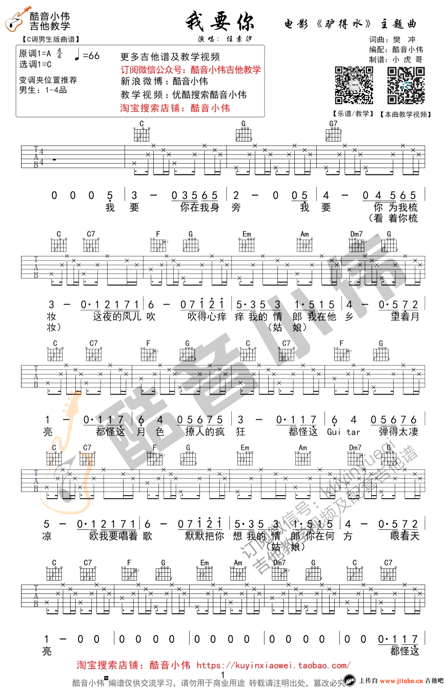 曲谱介绍: 我要你吉他谱,老狼任素汐电影《驴得水》主题曲。一首旋律很好听的歌曲。我要你六线谱,C调指法男生版,酷音小伟老师编配并带给琴友们弹唱教学。本曲谱分别制作了两个版本,G调版可以移步浏览。 我要你六线谱_G调弹唱教学视频