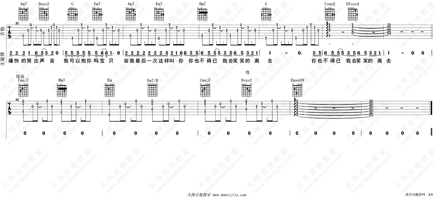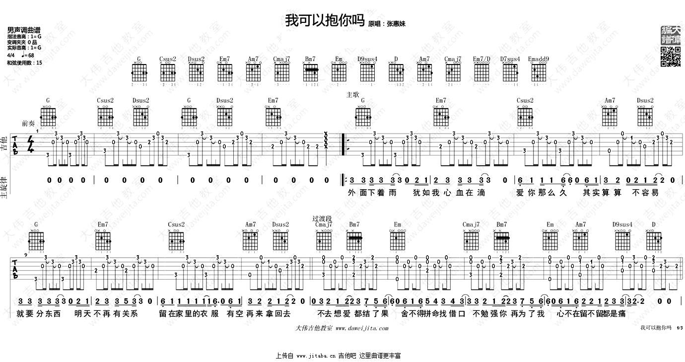 曲谱介绍: 张惠妹的经典歌曲《我可以抱你吗》吉他谱,男生版G调编配,原曲是江建民老师的编曲,我可以抱你吗吉他谱,六线谱图片高清版,这首歌参考了张惠妹女生版的吉他伴奏的特点,包括一些音型的律动尽量和原曲保持一致,只是和弦的指法有些不同。琴友们可以通过大伟老师的吉他教学视频,认真练习掌握。 91吉他谱www.jitaba.cn在这里也推荐其他编配版本的曲谱,供琴友们参考: 我可以抱你吗吉他谱_男声版六线谱 张惠妹 我可以抱你吗吉他谱