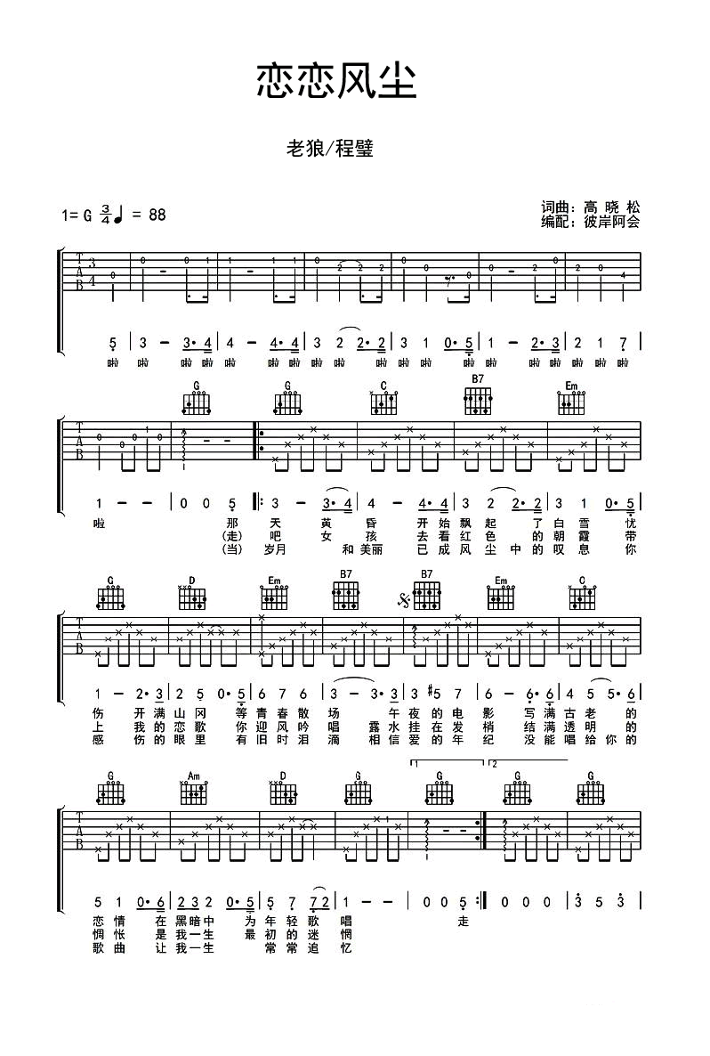恋恋风尘吉他谱 - 老狼/程璧 - G调吉他弹唱谱